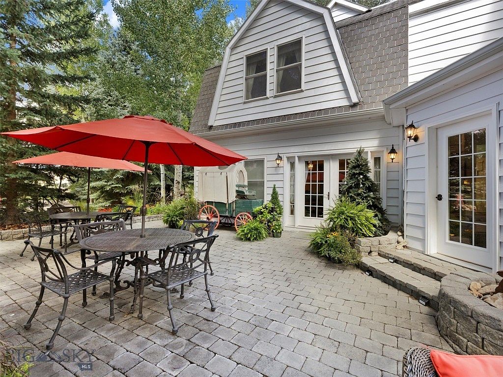 This outdoor patio area features a charming cobblestone floor with a circular metal table surrounded by matching chairs. Two vibrant red umbrellas provide shade over the seating arrangement, creating a welcoming atmosphere. Lush greenery surrounds the space, including tall trees and well-maintained shrubs, adding to the serene environment. Adjacent to the patio, French doors lead into the home, enhancing connectivity between indoor and outdoor living. The exterior walls of the house are adorned with light-colored siding, complemented by lantern-style lighting that adds character to the overall aesthetic.