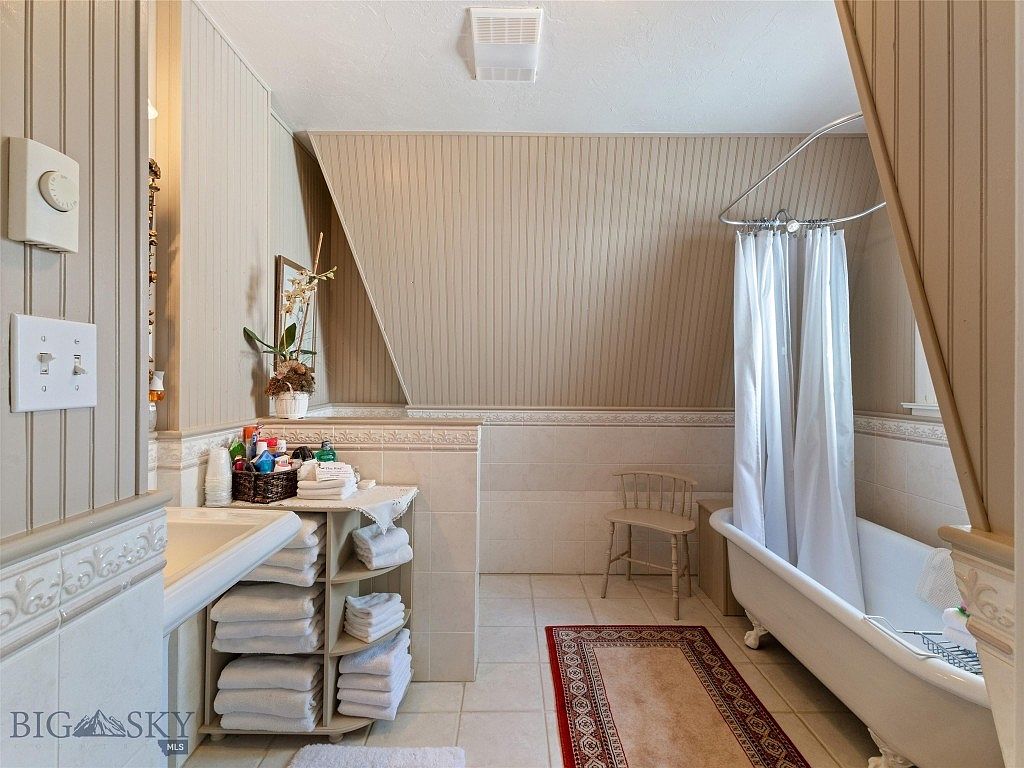In this charming bathroom, sloped walls create a cozy atmosphere, emphasizing its unique architecture. The walls are adorned with light beige paneling and a classic white tile border, providing a warm and inviting feel. A freestanding vintage bathtub is elegantly positioned to the side, facing a small wooden chair and a decorative rug in rich reds and browns. Organized towels are neatly stacked on a white shelf, while toiletries are arranged on a countertop, showcasing vibrant colors against soft neutrals. Natural light filters in softly, enhancing the tranquil ambiance, perfect for relaxation and comfort.