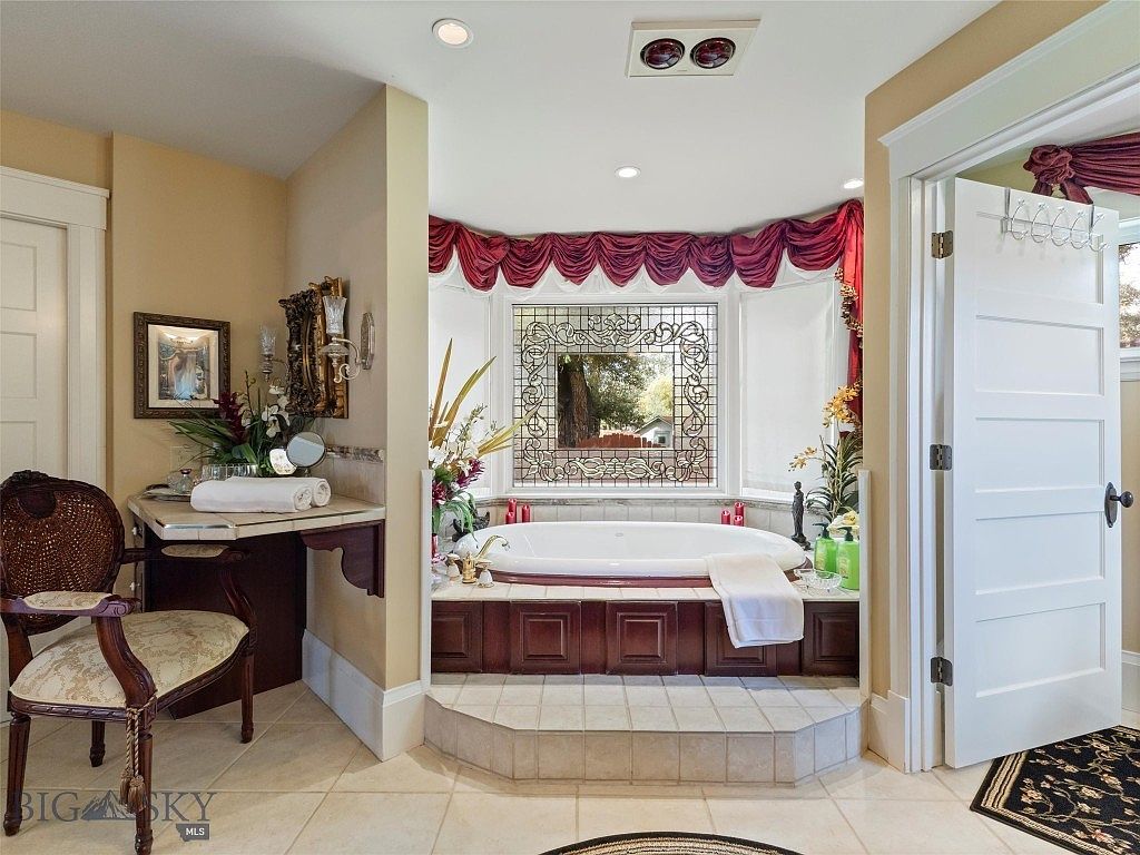 This luxurious bathroom features a large jacuzzi tub framed by elegant wood paneling, enhancing its opulence. A decorative window showcases intricate glasswork, allowing natural light while maintaining privacy. Rich burgundy curtains add a touch of drama, elegantly cascading by the window. A vintage-style chair and marble countertop provide stylish functionality, adorned with neatly rolled towels and floral arrangements. The floor tiles are light-colored, creating a soothing contrast with darker accents. Bright, modern lighting illuminates the space, highlighting its sophisticated decor. The overall ambiance is one of relaxation and refinement, making this bathroom a personal oasis.