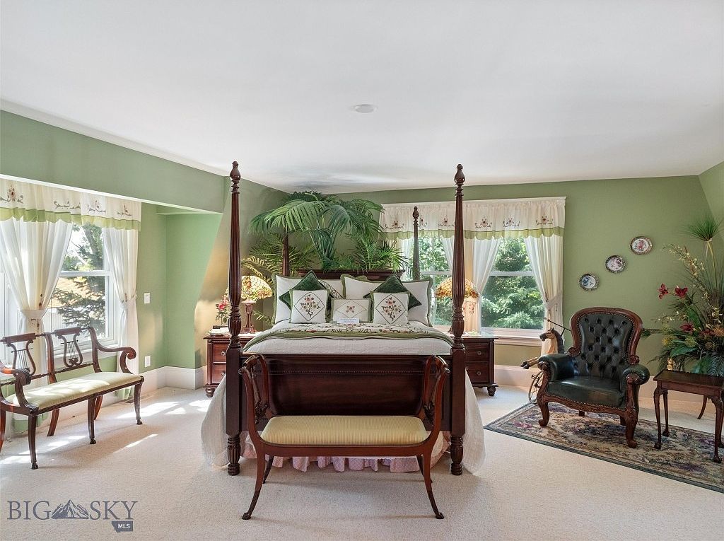 This serene bedroom features soft green walls and large windows adorned with delicate, patterned curtains allowing natural light to flow in. A grand four-poster bed, with intricate woodwork, serves as the centerpiece, enhanced by artfully arranged pillows and a lush throw. Flanking the bed, elegant carved chairs and a stylish accent table add vintage charm. A rich rug beneath the bed complements the color scheme, while a tasteful plant and decorative plates on the walls contribute to the room’s inviting atmosphere. The overall design melds traditional elegance with a refreshing, tranquil aesthetic.