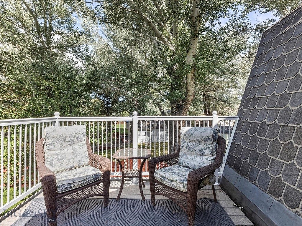 A cozy balcony showcases a pair of comfortable wicker chairs adorned with floral cushions, inviting relaxation. Between them stands a small glass-topped table, perfect for drinks or books. The flooring features a textured mat, adding warmth underfoot. Surrounding the space, lush greenery enhances privacy, with tall trees providing a serene backdrop. A white railing surrounds the balcony, complementing the light colors of the cushions and creating an airy feel. Architectural details include a sloped roof with shingles, adding a quaint charm to this inviting outdoor retreat, perfect for enjoying nature while sipping morning coffee.