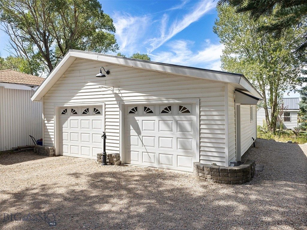 The image shows a two-car garage with a classic design, featuring white vinyl siding and two symmetrical garage doors adorned with small arch-shaped windows. The roof has a gentle slope, complementing the overall aesthetic. A light fixture hangs above the doors, adding a touch of functionality and style. The surrounding area is gravel, providing an easy-to-maintain surface. Lush greenery from nearby trees adds a natural backdrop, enhancing the garage’s appeal. This space presents a blend of practicality and charm, reflecting a well-kept property that harmonizes with its outdoor environment.