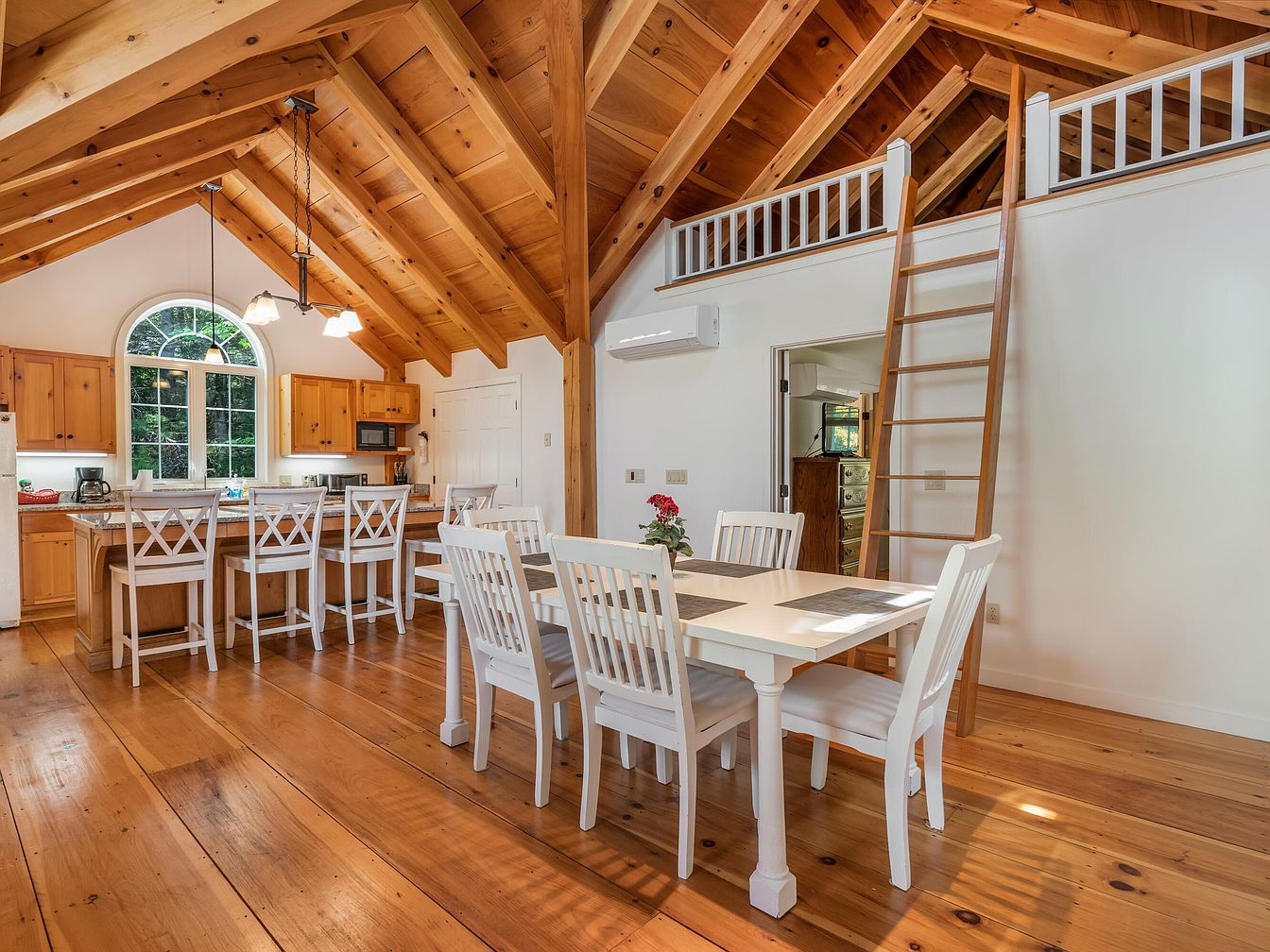 A spacious open-plan kitchen and dining area features warm, honey-toned wooden floors and ceilings with exposed beams, creating a cozy, rustic atmosphere ideal for family living. The kitchen includes a large island with four high-backed stools, perfect for gathering kids for breakfast or helping with homework. Ample natural light streams in through an arched window above pale wood cabinets, while white walls and matching white dining furniture brighten the room. A wooden ladder leads to a lofted area, adding space for play or quiet retreats. The inviting design balances practical family needs with charming, comfortable style.