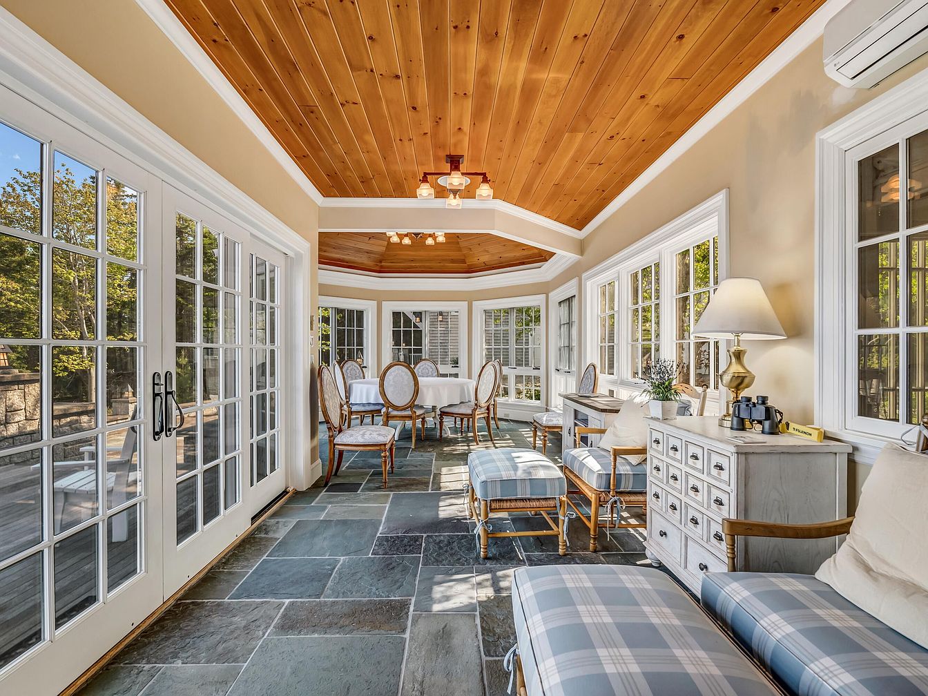 This spacious sunroom features large windows on three sides, bathing the space in natural light and offering beautiful outdoor views, making it a perfect place for families to relax and gather. The slate tile floor provides durability for children’s activities, while blue and white plaid cushioned chairs and ottomans offer inviting, comfortable seating. A set of French doors opens onto a deck, making it easy to transition between indoor and outdoor entertaining. The ceiling is finished in warm-toned wood, contrasting with the neutral beige walls and white trim, and a classic chandelier brings a cozy, homey atmosphere to this versatile living space.