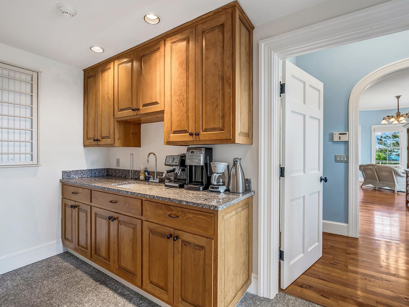 A compact kitchen nook featuring a coffee and beverage station, designed with warm, honey-colored wooden cabinets both above and below a speckled gray granite countertop. This area includes a small stainless steel sink, a modern espresso machine, coffee maker, and stainless steel carafe, perfect for morning routines or family gatherings. The cabinets offer ample storage for supplies and snacks, enhancing convenience for busy families. Recessed lighting creates a welcoming atmosphere, while an open doorway leads to a bright living area painted in powder blue with hardwood floors and white trim, emphasizing a comfortable and connected home layout.