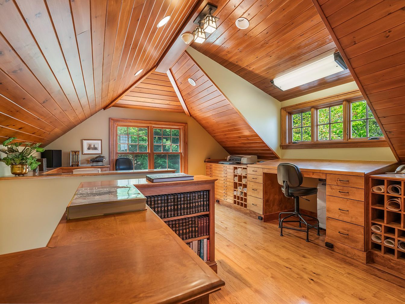This spacious loft-style home office features angled wood-paneled ceilings and matching hardwood floors, creating a warm, inviting atmosphere ideal for both work and creativity. Large windows on two walls allow natural sunlight to flood the space, providing clear views of lush greenery outside. Multiple built-in wooden desks and shelving units offer generous workspace and storage, including cubbyholes for documents or art supplies, perfect for families with children needing homework stations or parents working remotely. The coordinated neutral and wood tones enliven the room, while the organized, open-plan layout allows family members to share the room comfortably while maintaining individual space.