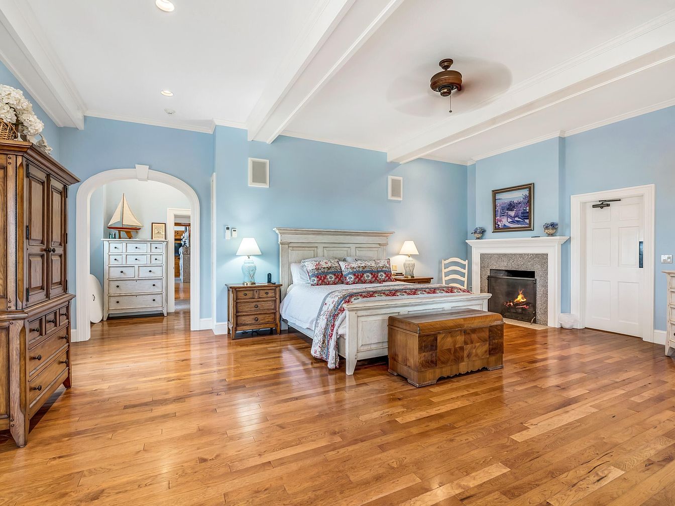 Spacious master bedroom with a warm and inviting ambiance, perfect for families seeking comfort. Light blue walls and crisp white ceiling beams provide a fresh, airy feel, complemented by honey-toned hardwood floors throughout. The room features a large bed with a classic wooden frame and colorful bedding, flanked by matching nightstands and soft lighting. A cozy fireplace adds charm and a sense of relaxation. Large oak furniture pieces, including a wardrobe and storage chest, offer ample space for belongings. An arched doorway leads to another room with additional storage, making the space practical and organized for family living.