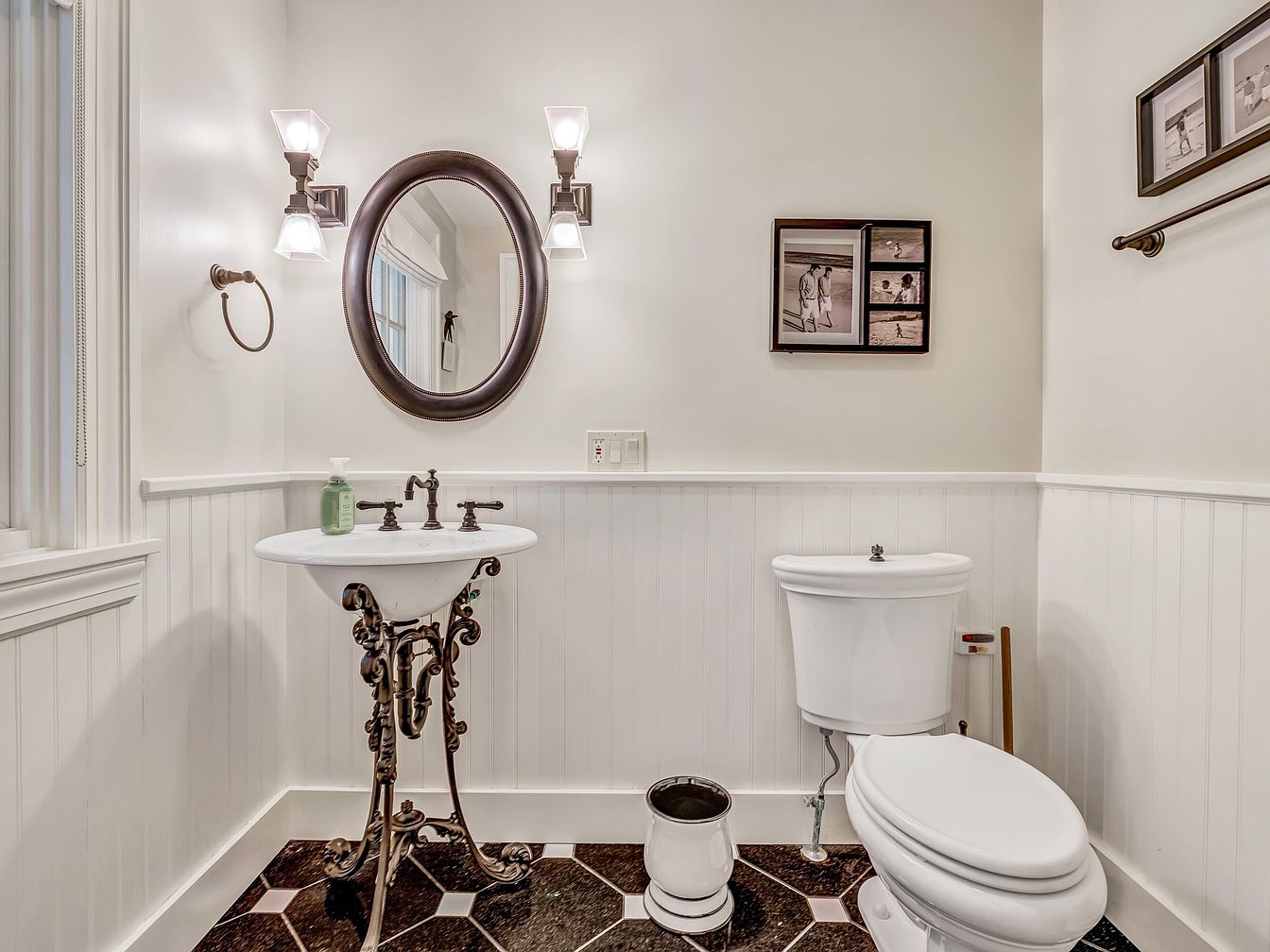 This bright and inviting bathroom features a classic design with white beadboard wainscoting on the lower half of the walls and smooth white paint above. A unique, ornate metal pedestal supports a white porcelain sink with vintage-style bronze fixtures, perfectly complemented by a round framed mirror above. Wall-mounted light sconces provide a warm glow, adding to the cozy and practical atmosphere. A standard white toilet sits opposite the sink, and family photographs add a personal touch to the neutral decor. The room showcases a durable patterned floor suited to family use and easy cleaning, making it as practical as it is elegant.