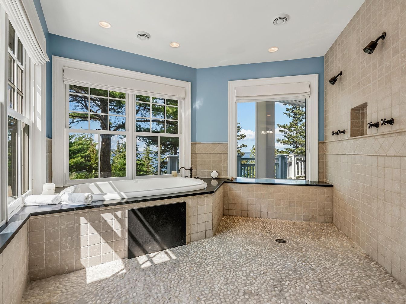 A spacious bathroom featuring a sunken soaking tub set against large picture windows that fill the space with natural light and offer a serene view of outdoor trees. Soft blue walls are accented by white trim, creating a soothing and fresh atmosphere. The floor is finished with pebble-textured tiles, adding tactile comfort and safety for families with children. Neutral beige ceramic tiles line the walls, contributing to the tranquil feel. Modern fixtures, recessed lighting, and rolled towels add practical elegance, making this a welcoming and relaxing space ideal for family routines and unwinding at day’s end.