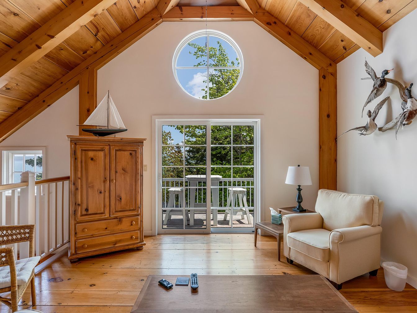 A cozy loft sitting area features exposed wooden beams and a pitched ceiling lined with warm honey-colored wood. Natural light pours in through a round window above double glass doors leading to a balcony, offering a view of leafy trees outside. The space is decorated with neutral tones, including an overstuffed cream armchair and a wooden armoire topped with a model sailboat. A simple wooden coffee table sits in the center, and a side table holds a classic lamp. Animal-themed wall art adds playful charm. The open railing and spacious layout make it safe and inviting for families, with room for relaxation and indoor play.