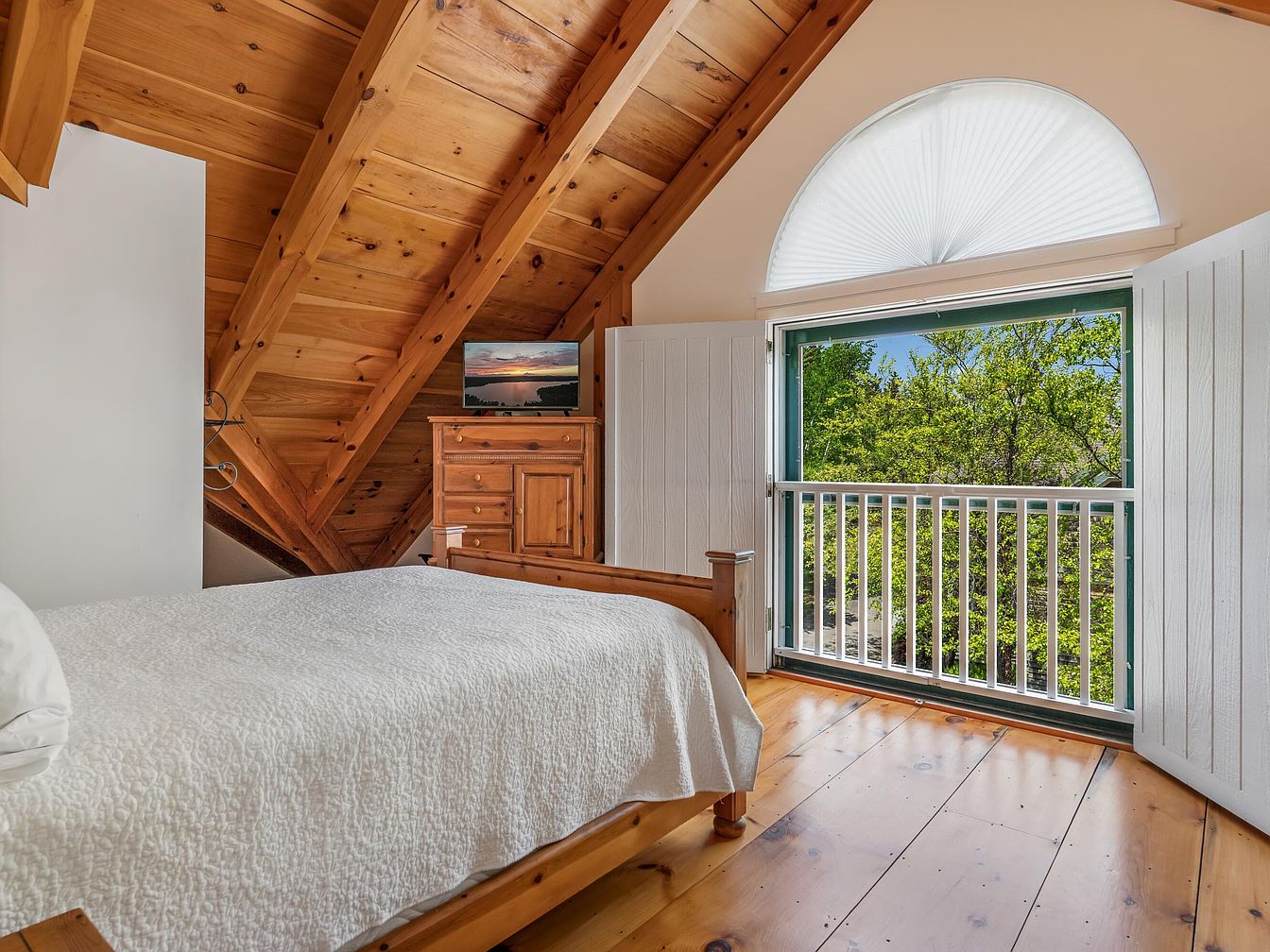 A cozy attic-style bedroom features warm, honey-toned wooden walls and ceiling beams for a welcoming, rustic atmosphere. Large planks of natural wood flooring add charm, while a simple wooden bed dressed in a textured white cover creates an airy, clean look. At the far side, a wooden dresser supports a television, blending convenience with classic style. The room opens to a balcony with double doors and a half-moon window above, allowing abundant natural light to fill the space and showcasing lush green trees outside, creating a peaceful retreat ideal for relaxing and safe for children thanks to the secure railing.