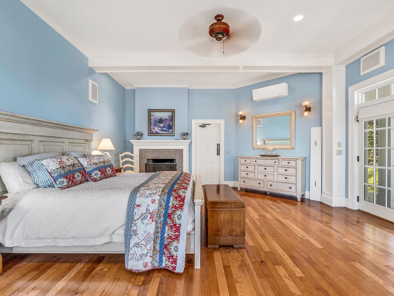 Spacious and welcoming bedroom featuring soft blue walls and crisp white trim, creating a soothing and pleasant environment perfect for family living. The large, comfortable bed is adorned with patterned pillows and a colorful quilt, balancing tradition and charm. Warm wooden floors extend throughout the room, adding a natural touch. A sturdy dresser with a matching mirror provides ample storage, while a wooden bench sits at the foot of the bed for convenience. French doors let in natural light, while a ceiling fan and built-in air conditioning unit contribute to comfort. Overall, the space feels airy, relaxing, and highly practical for families.