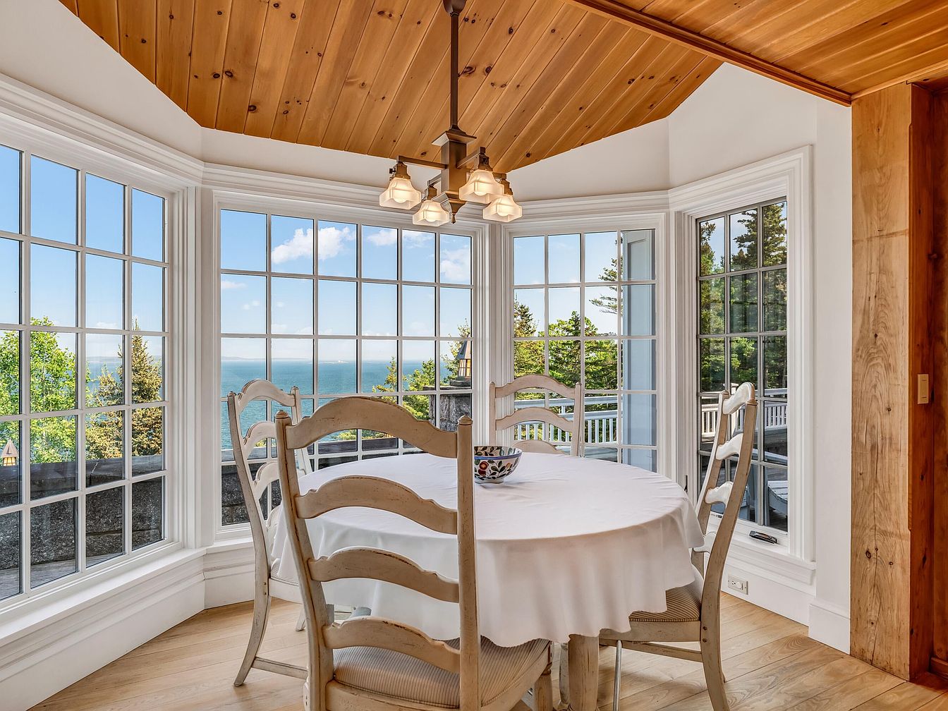 A bright, family-friendly dining nook featuring a round wooden table draped with a white tablecloth, surrounded by four rustic chairs with distressed white paint. Floor-to-ceiling windows form a bay alcove, flooding the space with natural light and providing uninterrupted views of the ocean and treetops beyond, perfect for shared meals and gatherings. The light wood plank flooring complements the paneled wood ceiling, creating a warm, inviting atmosphere. Architectural details such as crown molding and crisp white window frames add elegance. Spacious and open, this area is ideal for families to enjoy meals while taking in the scenic outdoor beauty.