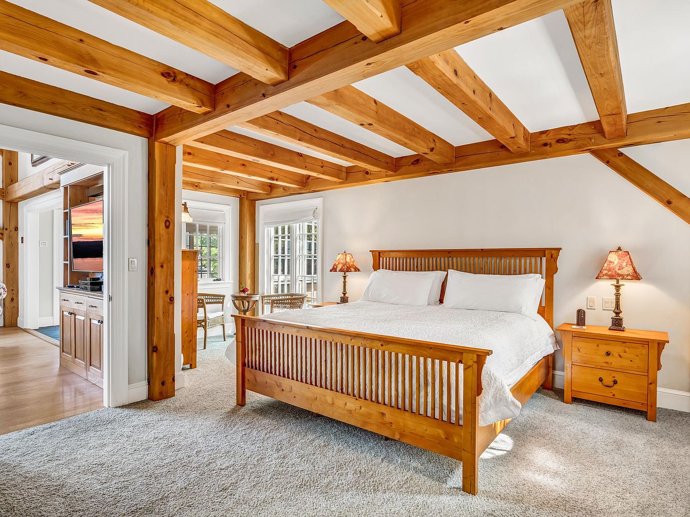 A spacious bedroom featuring exposed natural wood beams across the ceiling and matching wood trim creates a warm, welcoming atmosphere. The room is furnished with a large wooden slat bed with crisp white linens, flanked by two matching nightstands topped with decorative lamps. Soft, plush carpeting covers the floor, making it comfortable for children to play or relax. Sunlight pours in through multiple large windows, brightening the creamy white walls and offering a view into a cozy adjoining sitting or dressing area. The overall layout is inviting, practical, and well-suited for a family-oriented lifestyle.