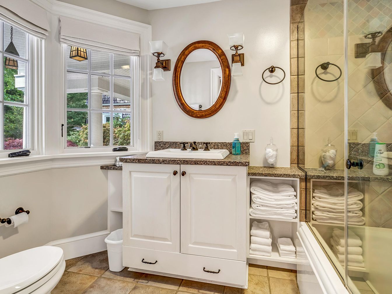 Bright and welcoming bathroom features a large window above the toilet, letting in lots of natural light and offering a view of a green yard. The central vanity has white paneled cabinets with ample open shelving underneath, neatly stacked with fresh white towels, making it practical for family use. The countertop is a speckled brown granite, adorned with hand soap and a tissue holder, as well as a framed round mirror above the sink. Warm tan tiles line the floor and continue into the glass-enclosed shower, which enhances the room’s clean and updated aesthetic.