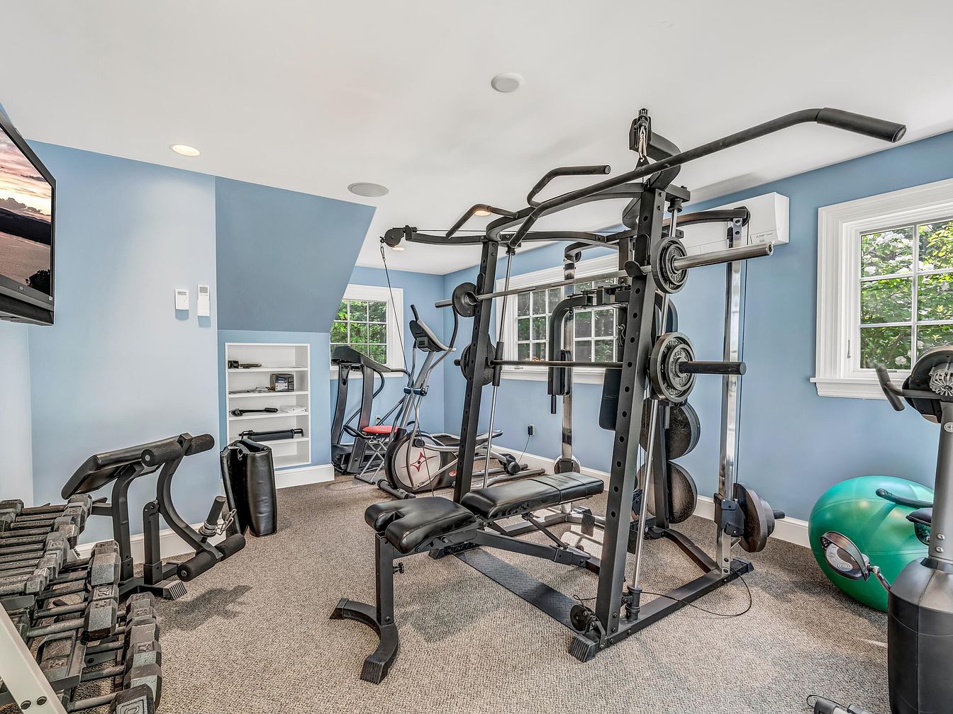 A spacious and inviting home gym featuring a variety of exercise equipment, perfect for families prioritizing health and fitness. The room is painted in soothing light blue tones, promoting a calm and motivating atmosphere. Large windows allow an abundance of natural light to brighten the space, while the plush, neutral-colored carpet provides a comfortable surface for workouts. Equipment includes a full multi-station weight system, a stationary bike, an elliptical machine, a set of free weights, resistance bands, and stability balls, accommodating users of all fitness levels. Built-in shelves organize smaller items, ensuring a clean and clutter-free environment for safe family use.