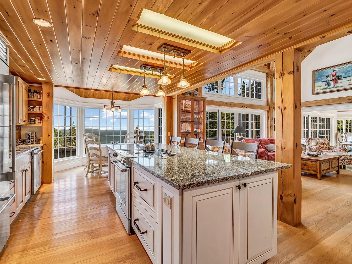 A spacious, sun-filled kitchen and family area with a large granite-topped island and seating for six, ideal for gatherings or family meals. Warm honey-toned wood covers the floor, ceiling, and exposed beams, giving the space a cozy, rustic feel. Ample windows and French doors line the walls, bathing the area in natural light and providing panoramic views of lush greenery and a distant lake or ocean. The soft cream cabinetry, stainless steel appliances, and open shelving enhance practicality for family cooking. An adjacent dining nook with bay windows and a relaxed living space complete this welcoming, functional family zone.