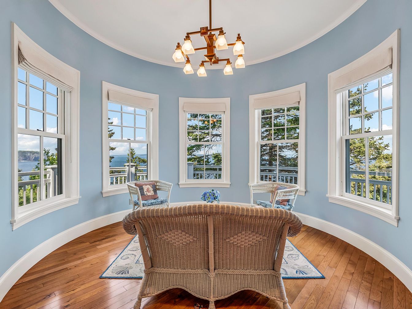 A sunroom featuring expansive, curved walls painted in a gentle sky blue, paired with lustrous hardwood floors that add warmth. Five large windows encircle the space, providing panoramic views of nature and distant water, making this an inviting spot for relaxing or family gatherings. The room is furnished with a wicker loveseat and two matching armchairs, arranged around a small rug and a low, central table adorned with a vase of blue flowers. A modern, geometric chandelier hangs above, providing ambient light. The layout is open and airy, filled with natural light, and ideal for children to play or families to enjoy quiet afternoons together.