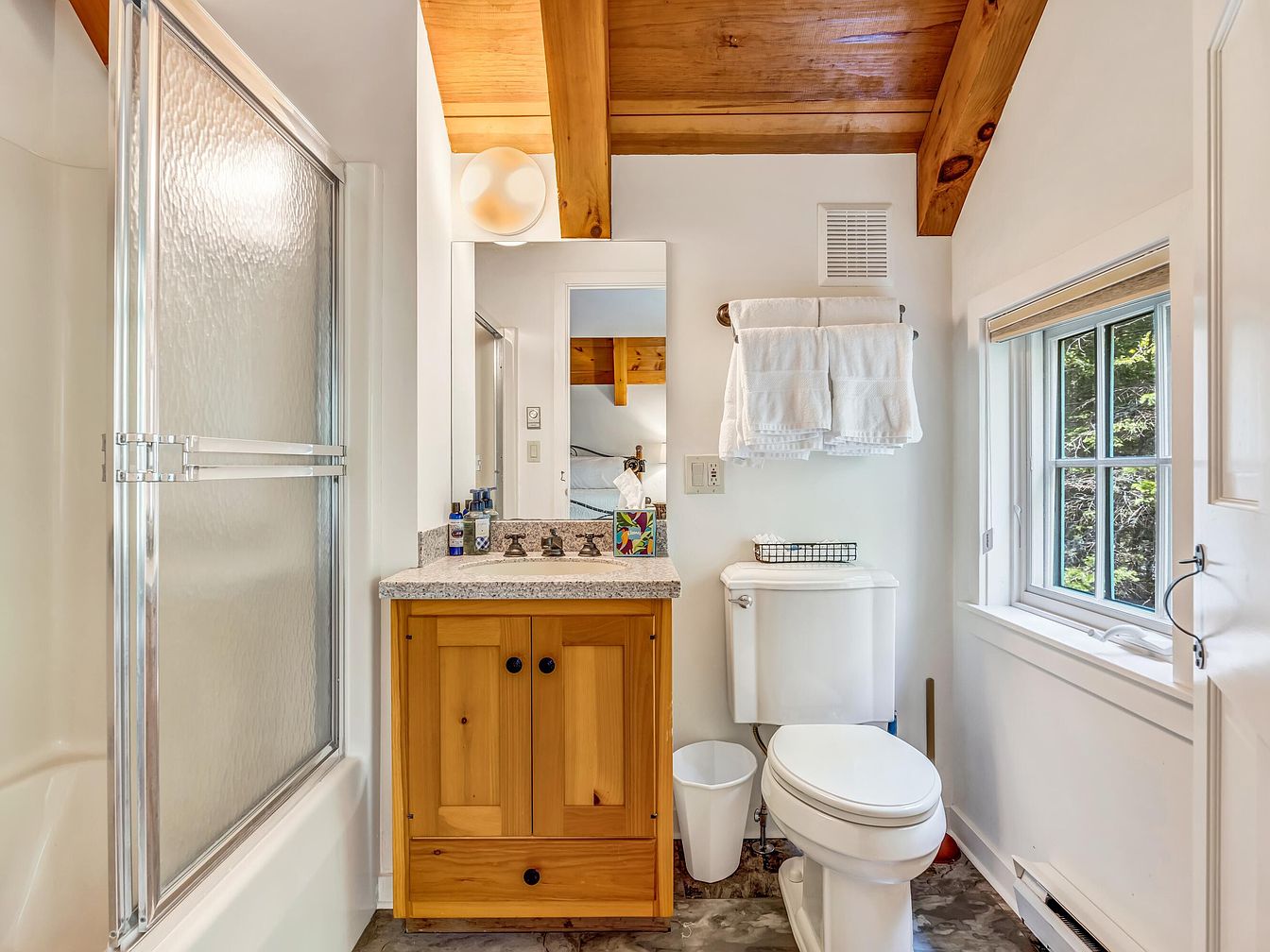 A bright, inviting bathroom featuring a natural wood vanity with granite countertop, creating a warm and rustic atmosphere. The space is thoughtfully arranged with a large mirror above the sink and neatly folded white towels on a wall-mounted rack, promoting a tidy and family-friendly environment. The walk-in shower has sliding glass doors for safety and easy access, making it suitable for families with young children or elderly members. Natural light pours in through a window with white trim, illuminating the clean, white walls and adding to the fresh, uplifting feel of the room. Durable tile flooring enhances practicality for daily family living.