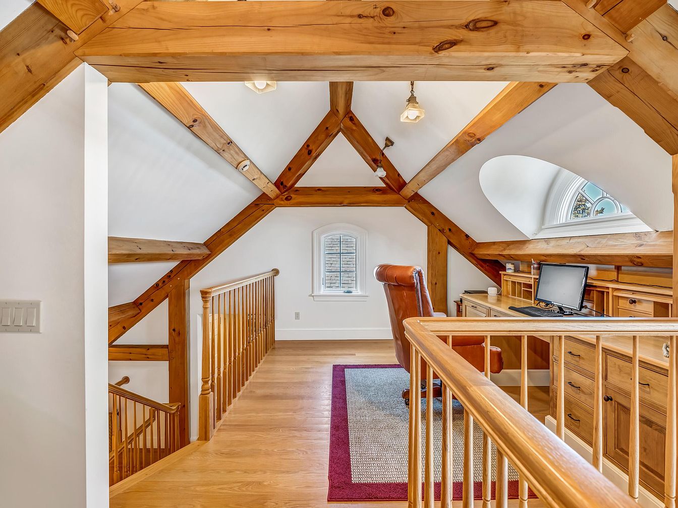 An inviting loft home office features exposed wooden beams crossing the white vaulted ceiling, adding warmth and character to the space. Golden hardwood floors extend throughout, complemented by a wooden railing that securely lines the stairs and walkway, ideal for families with children. A large built-in wooden desk offers ample workspace, with a computer and thoughtfully arranged supplies, making it perfect for remote work or homework sessions. Natural light floods the room through an arched window and a rectangular window, creating a bright, airy atmosphere. A plush leather office chair and an area rug in soft gray bordered by red provide both comfort and subtle color accents.