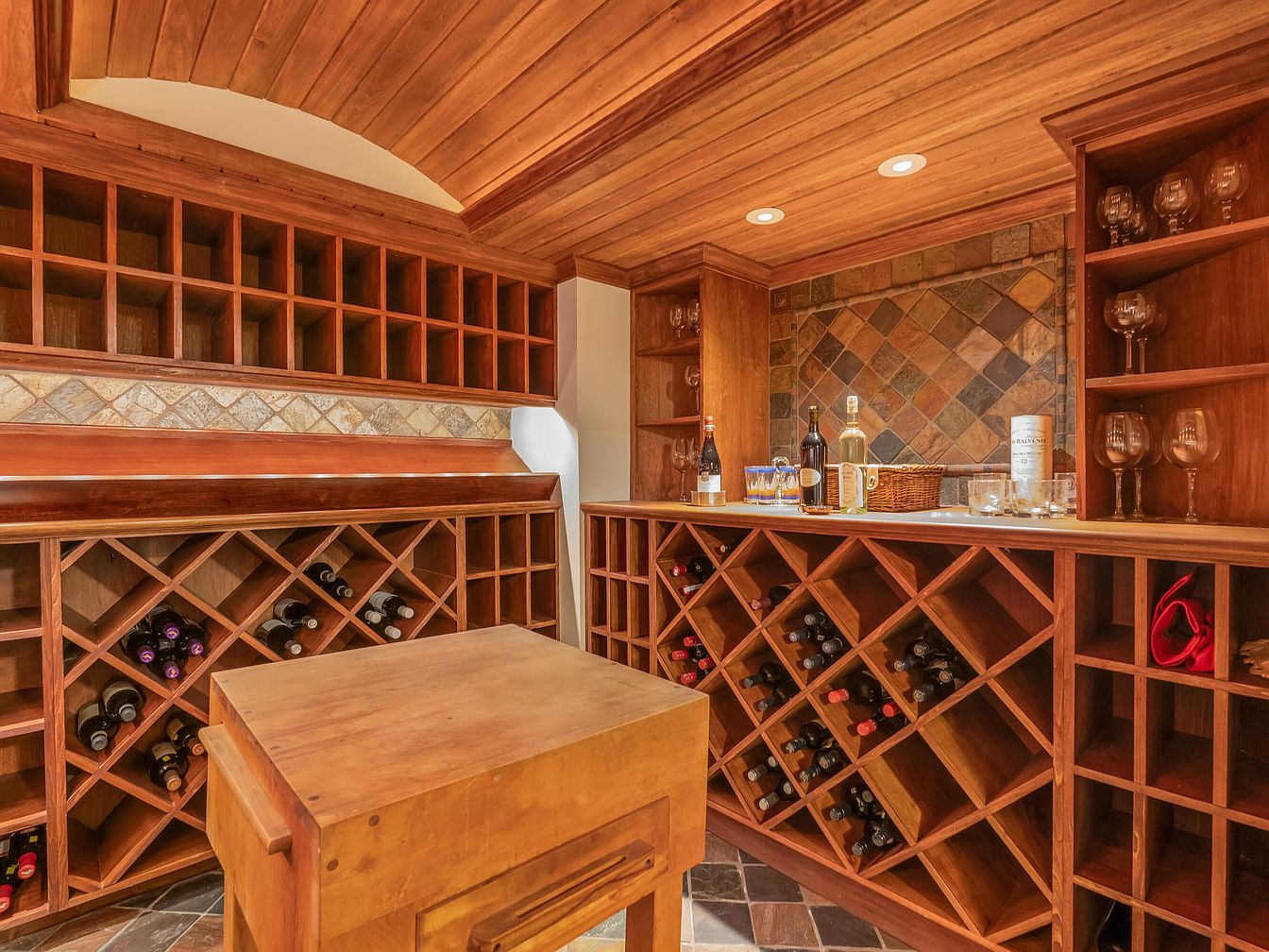 Warmly lit with recessed lights, this wine cellar features rich wood cabinetry and an elegant wood-paneled ceiling, radiating a cozy atmosphere ideal for gatherings. The space is filled with custom wine racks arranged in symmetrical geometric patterns, providing ample storage for wine bottles. A countertop a offers a tasting area, surrounded by slate tile details on the wall for rustic sophistication. Shelving is arranged to hold glassware and entertaining essentials. The earthy color palette, deep browns, amber tones, and natural stone highlights, creates a welcoming, family-friendly environment for hosting events, storing collections, and enjoying quality moments together.