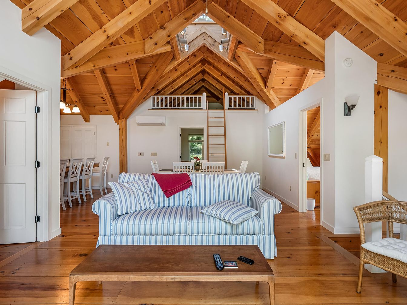 A spacious living room is featured with a vaulted, exposed pinewood ceiling and rich wooden floors, evoking the warmth of a cozy cabin. At the center, a blue-and-white striped couch with plump cushions faces a sturdy, rectangular wooden coffee table, which holds a couple of remote controls for convenient family entertainment. A soft red throw adds a pop of color to the neutral palette. The open layout flows into a family dining area with a large table and white chairs, making it ideal for gatherings. Bright natural light streams in, highlighting white walls and airy architectural beams. Ladder access to a loft space adds charm and potential for children’s play or extra sleeping quarters.