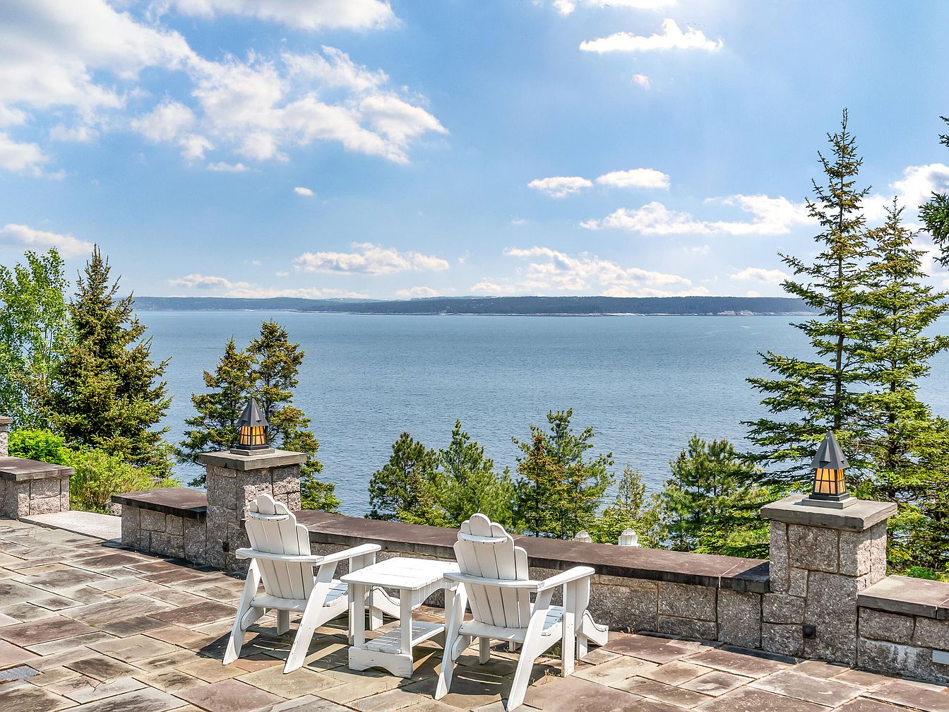 Expansive stone patio overlooking a serene, wide lake, framed by lush green trees and a vast blue sky. The area features two white Adirondack chairs paired with a matching side table, perfect for relaxing or family gatherings. The surrounding stone walls create a safe, defined space for children to play, with decorative lanterns adding a touch of warmth and charm. The peaceful waterfront view provides a calming backdrop, while the spacious patio allows families to enjoy outdoor dining, games, or simply unwinding together, with plenty of room for seating and socializing in a beautiful natural setting.