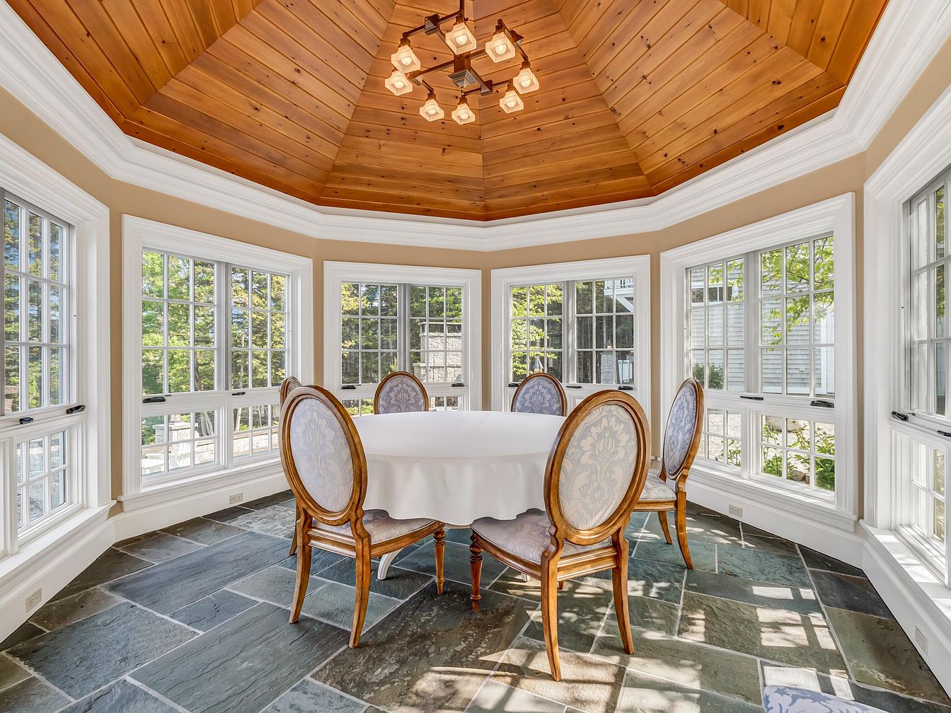 A bright and welcoming sunroom features an octagonal design with large windows on every wall, allowing natural light to flood the space and offering picturesque views of the outdoors. The wood-paneled ceiling adds warmth and character, complemented by a modern chandelier that creates a cozy ambiance. A round table with a crisp white tablecloth sits at the center, surrounded by four upholstered chairs with elegant wooden frames, perfect for family meals or gatherings. The slate tile flooring is both practical and stylish, providing durability for children and easy maintenance. Soft beige walls and white window trim complete the fresh, inviting atmosphere.