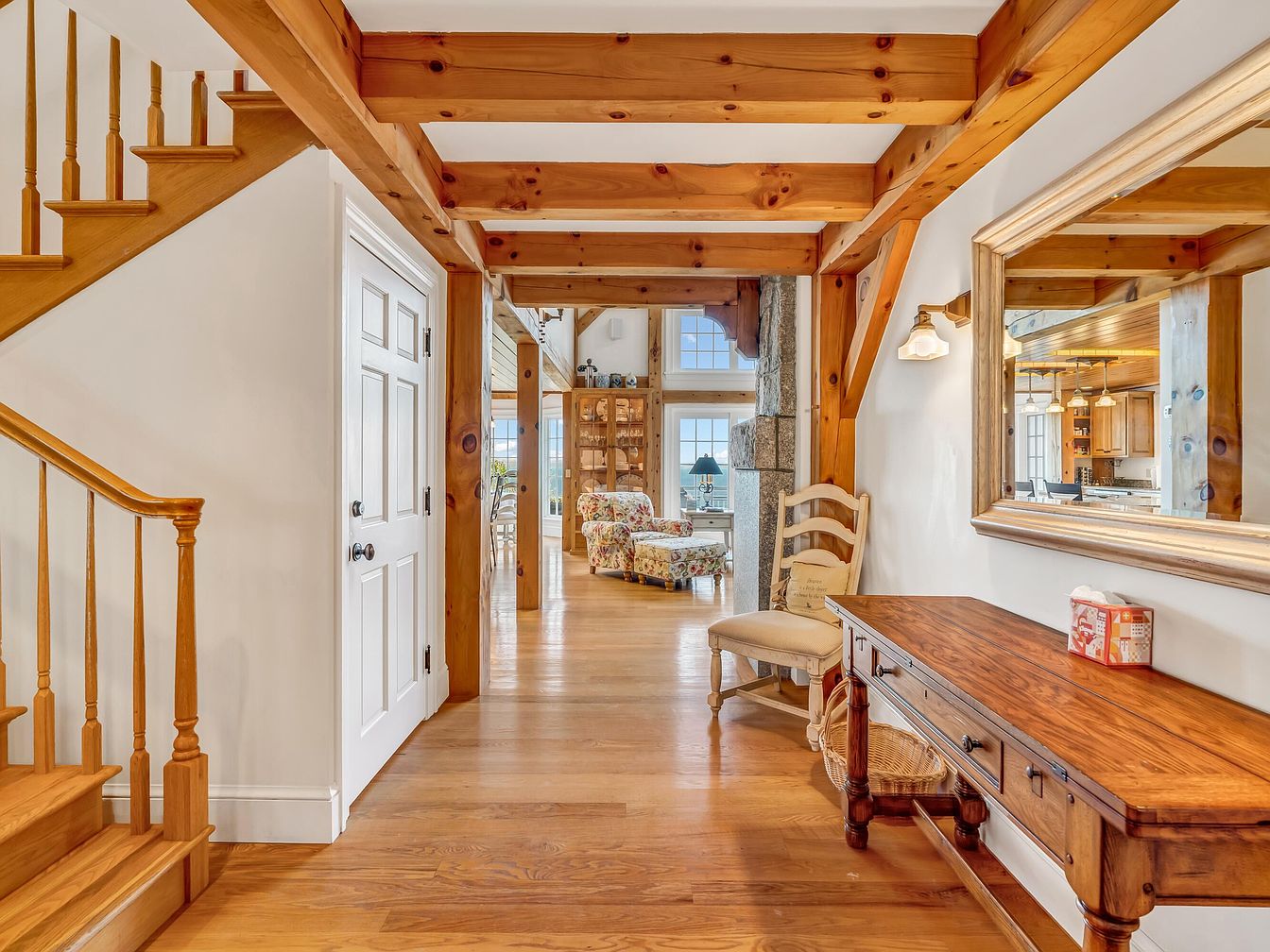 Warm and welcoming, this hallway entrance features natural wood beams and honey-toned hardwood floors that create an inviting atmosphere. The space boasts a sturdy wooden staircase and a white paneled door, complementing the white walls for a bright, open feel. A rustic wooden console table, accented by a large framed mirror, offers practical storage and a stylish touch. The hallway leads into a spacious, light-filled living area with comfortable seating and family-friendly open sightlines, ideal for keeping an eye on loved ones. Soft golds, creams, and wood finishes blend to form a cozy, harmonious living environment perfect for families.