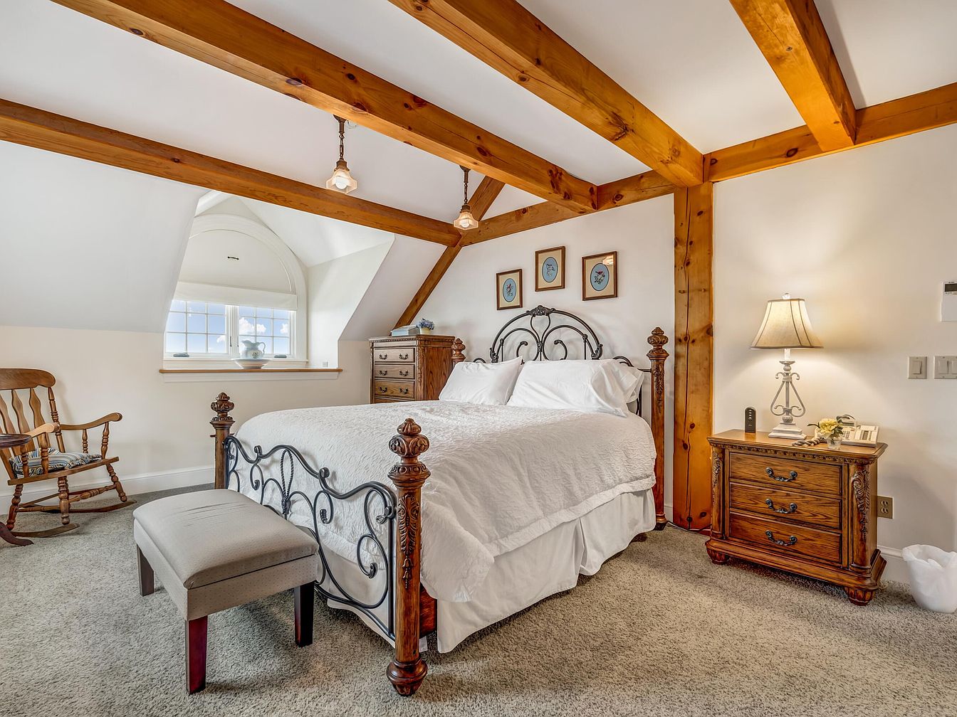 A cozy and inviting bedroom features a plush carpeted floor and a large bed with an ornate wrought iron headboard and matching posts. Wooden beams with a warm, honey finish stretch across the ceiling, adding rustic charm and architectural interest. Natural light pours in from a dormer window, creating a bright and airy atmosphere, while a comfortable wooden rocking chair sits in one corner, perfect for family relaxation or bedtime stories. Classic wooden nightstands and a dresser provide ample storage, and soft neutral tones paired with white bedding contribute to a calm, family-friendly environment designed for peaceful rest.