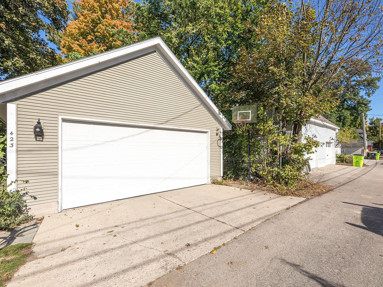 The image shows a spacious, two-car garage featuring a smooth white door that contrasts with its light taupe siding. The structure is designed with a sloped roof, enhancing its modern aesthetic. A vintage-style wall lantern adds character beside the door, casting a warm glow. The pathway leading to the garage is concrete, bordered by small patches of grass, while a nearby basketball hoop stands against a backdrop of vibrant trees in autumn colors. The garage’s clean lines and well-maintained appearance reflect a practical yet inviting visual that integrates with the surrounding environment.