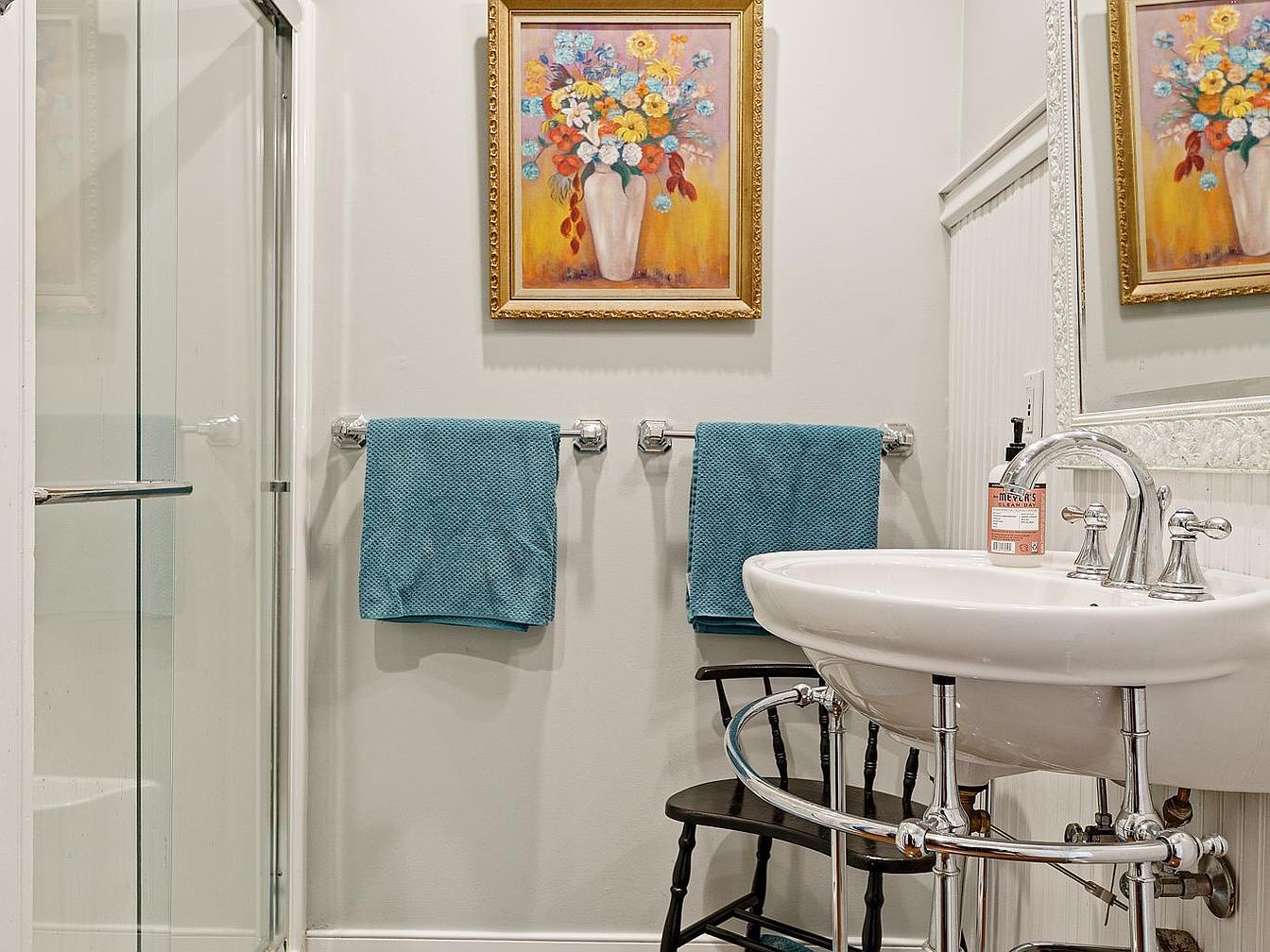 This compact bathroom features a stylish blend of contemporary and classic design elements. A clear glass shower enclosure showcases modern aesthetics, while the pedestal sink evokes vintage charm, supported by a chrome base. The muted gray walls contrast beautifully with vibrant floral artwork framed in gold, adding warmth and character. Aqua-colored towels hung neatly enhance the color scheme, bringing a refreshing pop that complements the soft tones. The intricate white wainscoting adds texture and elegance, while a simple black chair creates functional decor. Soft lighting casts a welcoming glow, enhancing the overall inviting ambiance of the space.