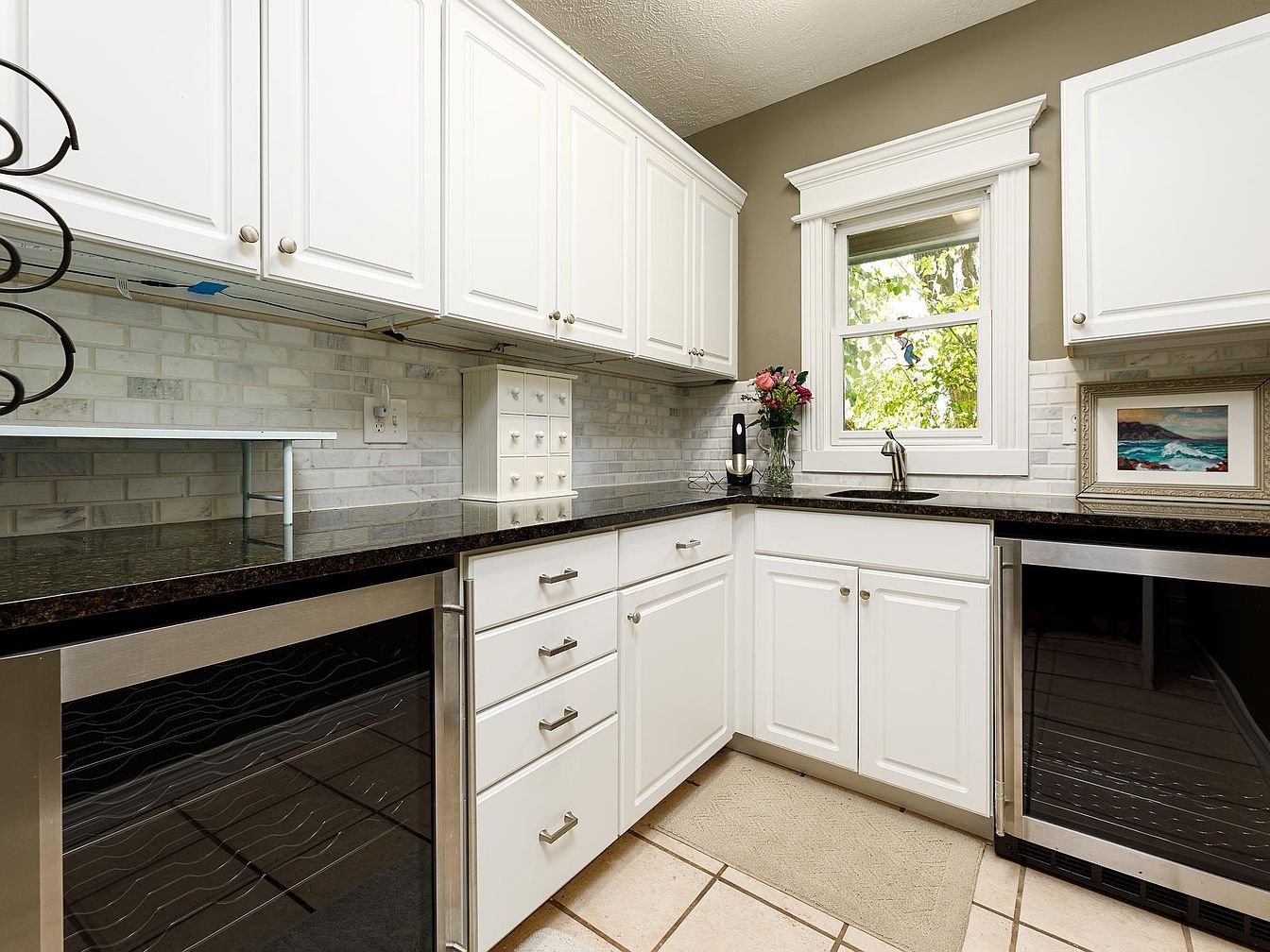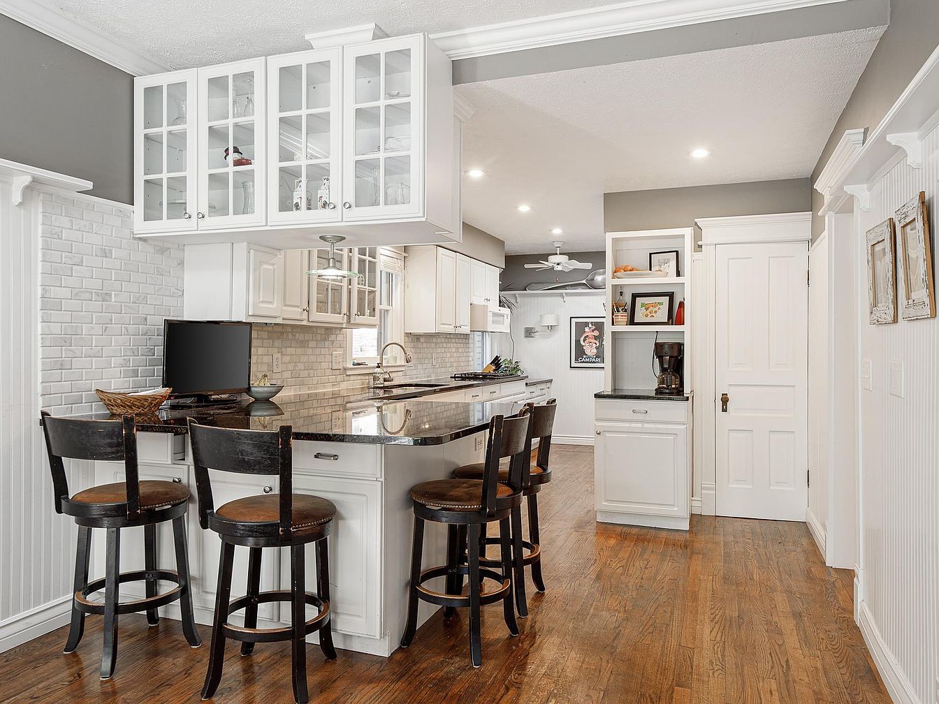 This kitchen features a modern design with a sleek black granite countertop and a contrasting white cabinetry. Upper cabinets with glass panels display decorative dishes, creating an open feel. The backsplash is a subtle gray mosaic tile, enhancing the overall color scheme of muted grays and whites. A small breakfast bar is set with black wooden stools that have brown leather seats, inviting casual dining. Natural light pours in from windows, highlighting a cozy and functional layout. Near the exit, a white door contrasts with the dark wooden flooring, which adds warmth to the space.