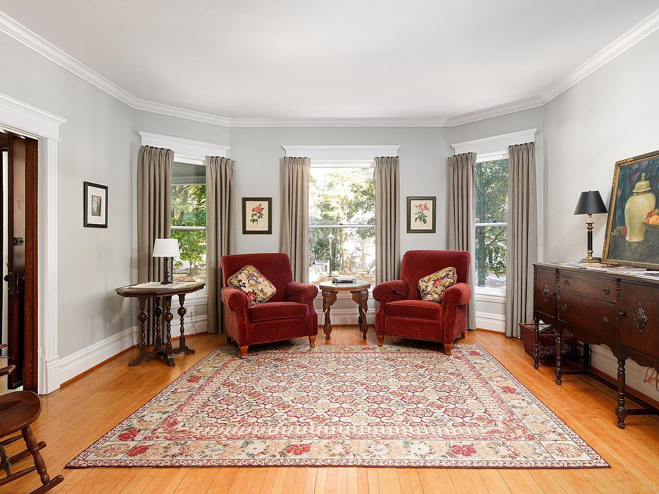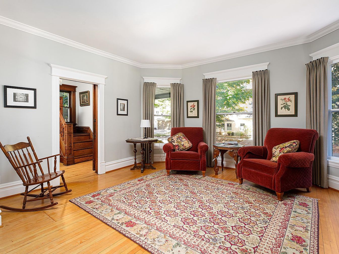 This living room showcases a warm and inviting atmosphere. The walls are painted in a soft gray, complemented by white crown molding and trim. Two plush, deep-red armchairs with floral-patterned throw pillows create a cozy seating area, accompanied by a decorative accent rug featuring intricate floral designs. A small wooden side table with a lamp sits nearby, offering functional elegance. Windows are dressed with flowing taupe curtains, allowing ample natural light to flood the room. Framed artwork adorns the walls, enhancing the classic aesthetic. A wooden rocking chair adds a nostalgic touch, inviting relaxation.