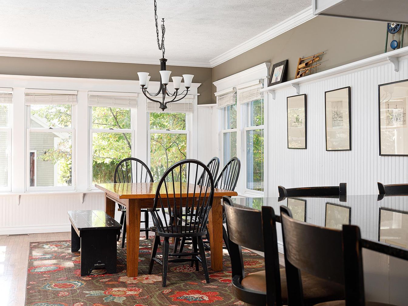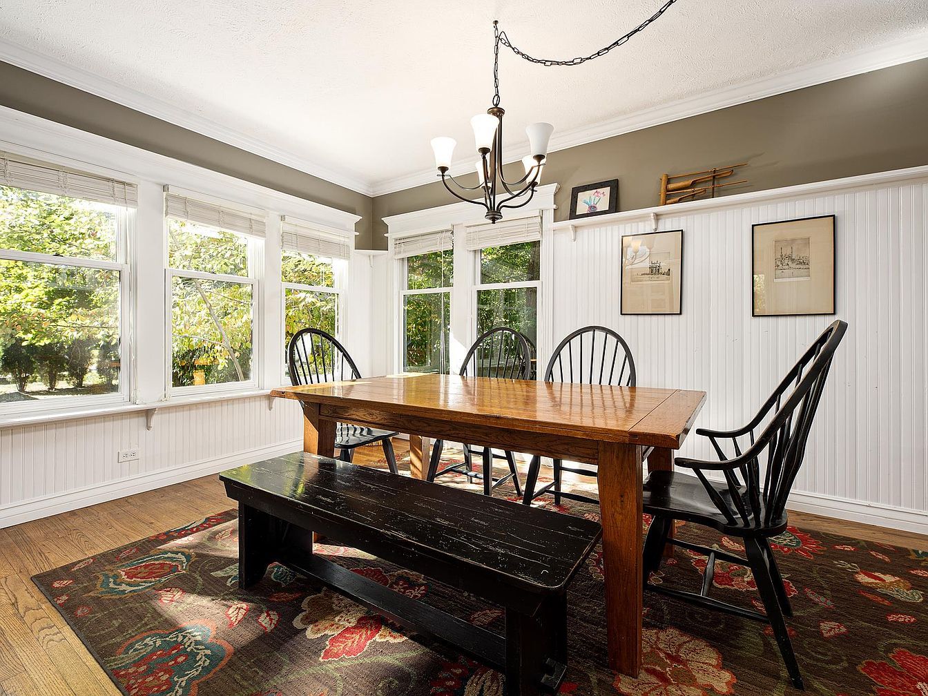 This dining room features a blend of classic and rustic charm. A sturdy wooden table sits at the center, accompanied by black spindle-back chairs. A long, black bench adds extra seating, harmonizing with the table’s finish. The walls are painted a muted green, enhancing the bright white wainscoting and crown molding. Large windows allow an abundance of natural light, framing views of the lush outdoor scenery. Decorative elements, including framed artwork, add character to the space. The warm wooden flooring is accentuated by a rich, patterned area rug that complements the room’s color palette.