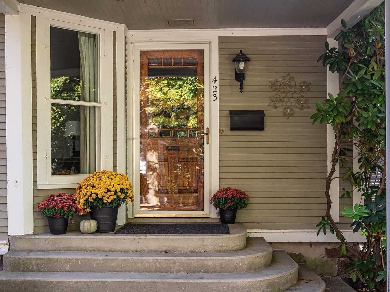 The front porch features a welcoming entry with a wooden door framed by light-colored sidelights. Above the door, a decorative light fixture casts a warm glow, enhancing the inviting atmosphere. Earth-toned vertical siding complements the home, while gray steps lead to the entrance. Two potted mums, one yellow and one dark red, add vibrant seasonal color against the neutral tones. A small pumpkin rests on the step, adding a touch of autumn charm. Lush greenery flanks the porch, harmonizing with the natural surroundings, while the overall design conveys a cozy and approachable aesthetic.