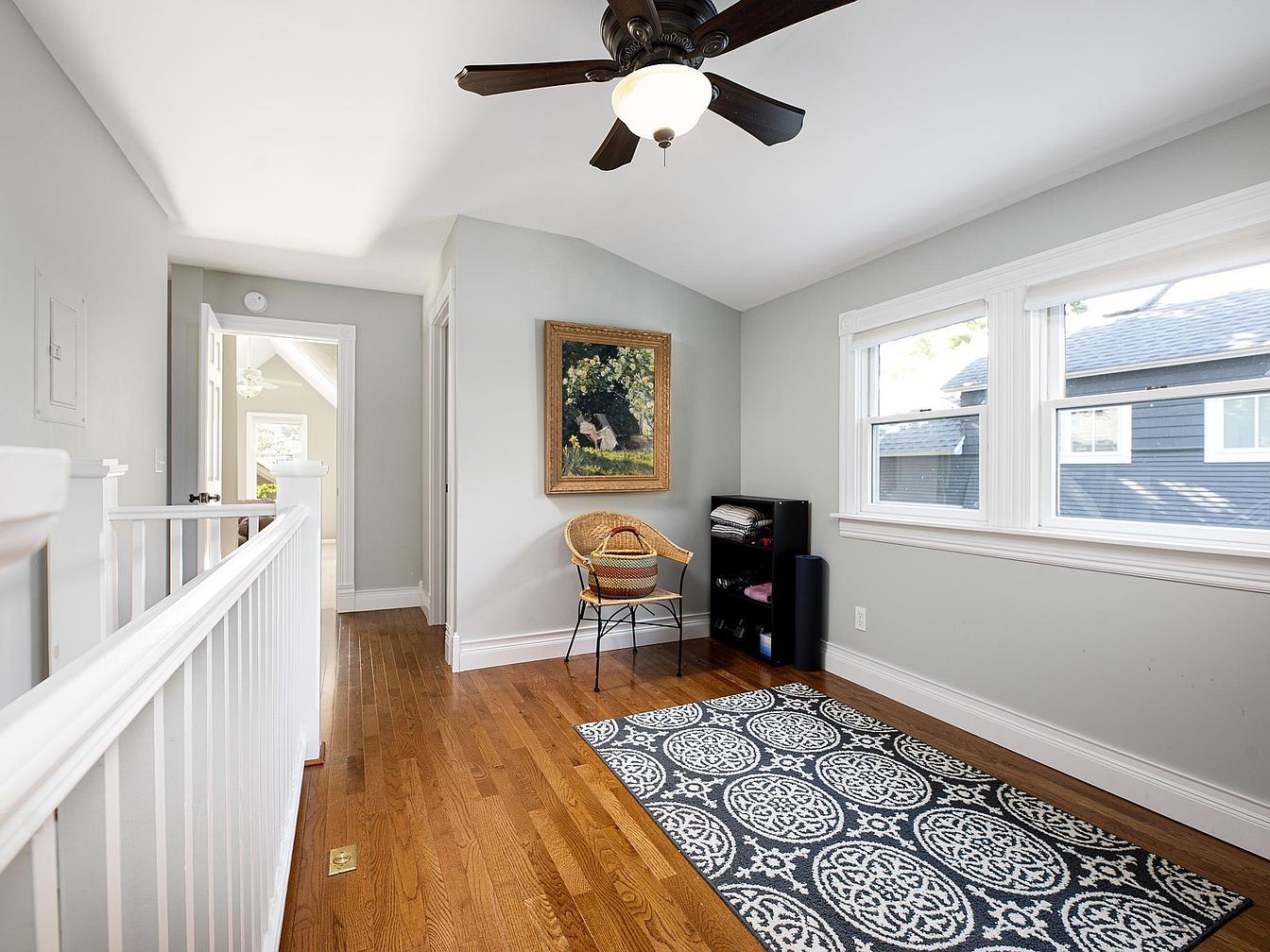 The upper hallway showcases a blend of modern elegance and classic charm. Wall colors in soft gray create a calming atmosphere, complementing the rich, polished hardwood flooring. Natural light floods the space through large, double-hung windows, accentuating the detailed white trim. A framed painting adds a touch of artfulness, contrasting beautifully against the wall. A stylish woven chair invites relaxation, while a sleek black shelving unit provides functional storage. A decorative area rug featuring intricate patterns brings warmth and texture. The ceiling fan with light fixture enhances airflow, making this space both welcoming and practical.