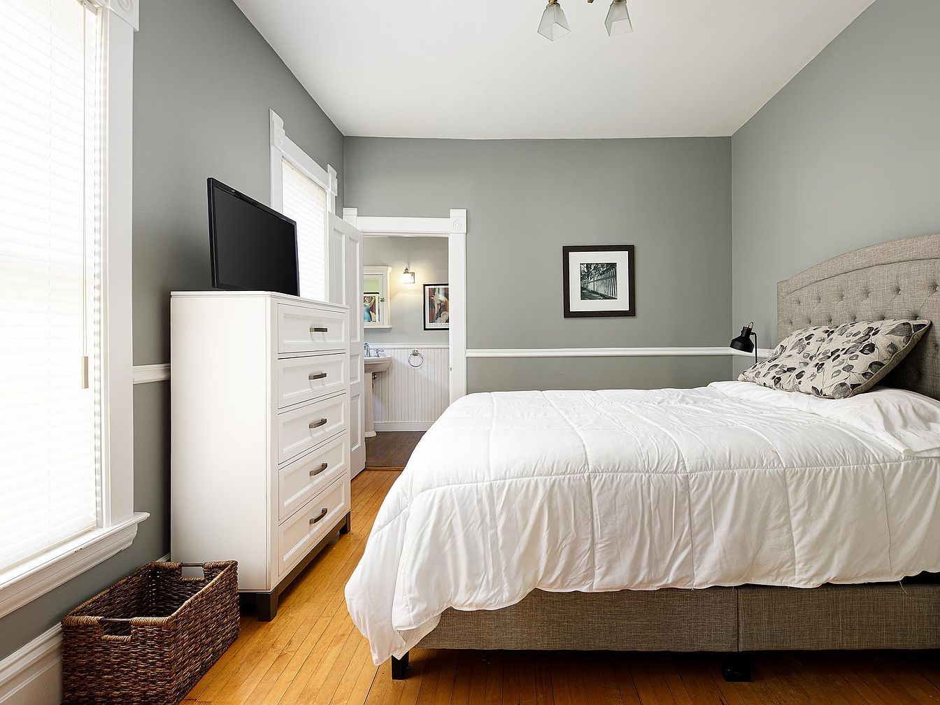 A cozy bedroom features a muted gray color palette that lends a calming atmosphere. The queen-size bed, adorned with a plush, tufted headboard and white bedding, is positioned against the wall, inviting relaxation. A decorative pillow adds a touch of pattern and texture. To the left, a stylish white dresser with sleek handles complements the light wood flooring, while a woven basket underneath adds a natural element. A wall-mounted lamp provides functional lighting, contrasting with the soft natural light streaming through the adjacent window. The adjoining bathroom hints through an open doorway, enhancing the sense of space.