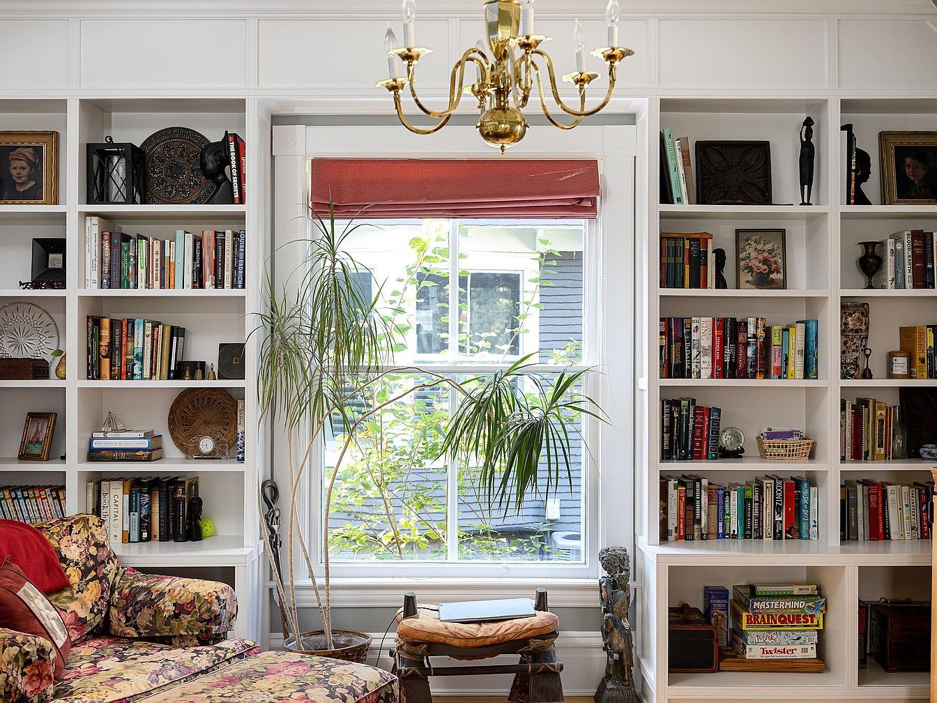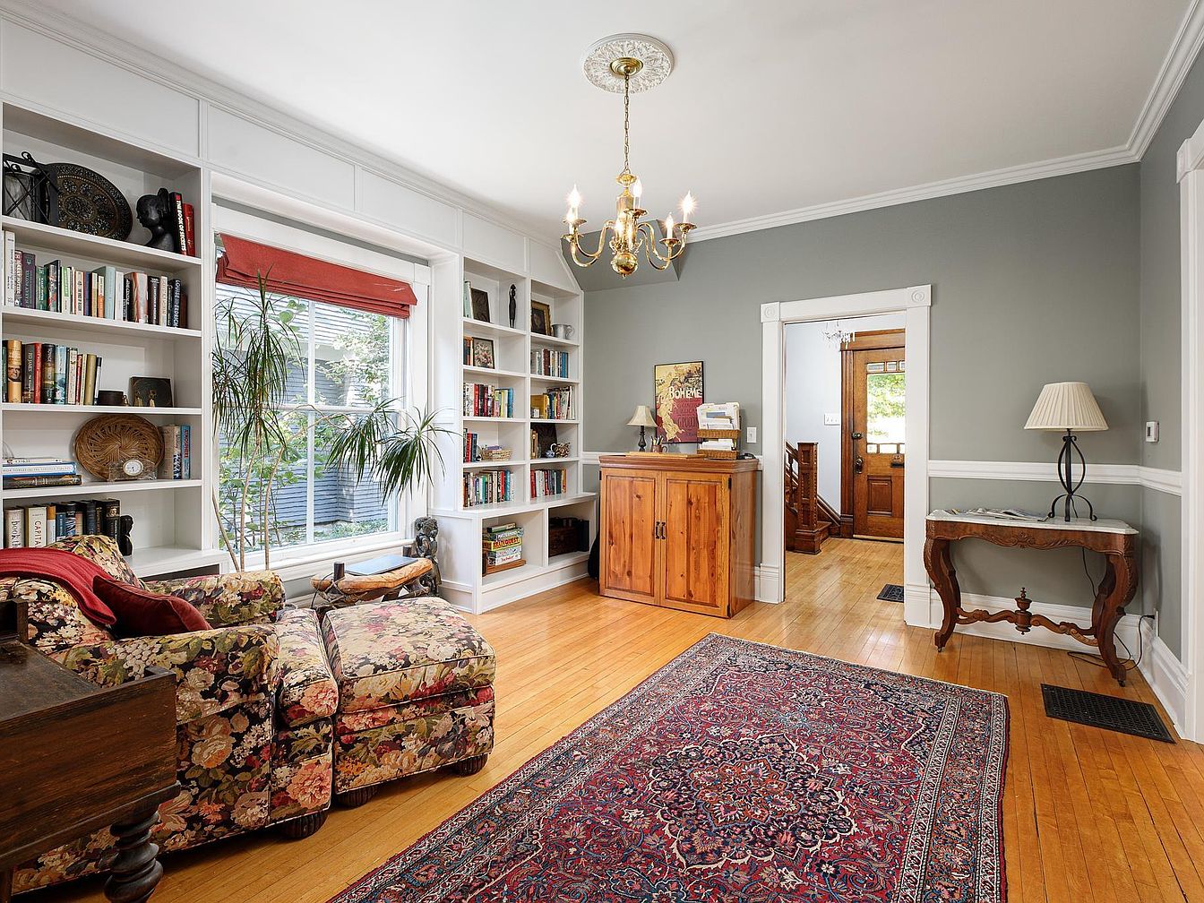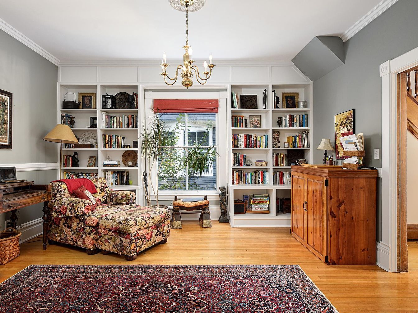 This living room features a harmonious blend of vintage charm and modern comfort. A pair of floral-patterned armchairs with matching ottoman invites relaxation, while a vibrant Persian rug lays underfoot, adding warmth. Built-in bookshelves line the wall, showcasing an array of literature and decorative items, with a large window providing natural light and views of greenery outside. The walls are painted in a soft grey, contrasted by crisp white trim and a classic chandelier, enhancing the elegance. An antique wooden cabinet and a stylish console table complete the layout, contributing both functionality and aesthetic appeal to the space.