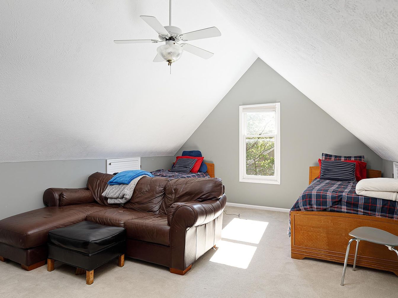 This guest bedroom features a cozy layout under a sloped ceiling, creating an inviting atmosphere. The walls are painted a warm, soft gray, harmonizing with the light carpet. A dark brown leather sectional sofa provides comfortable seating and a place to unwind. Two beds are styled with colorful plaid bedding, accented by red and blue throw pillows. Natural light floods the room through a white-framed window, highlighting the simple furnishings, including a wooden bed and a minimalist metal chair. The overall aesthetic is casual and functional, making it a perfect retreat for guests.