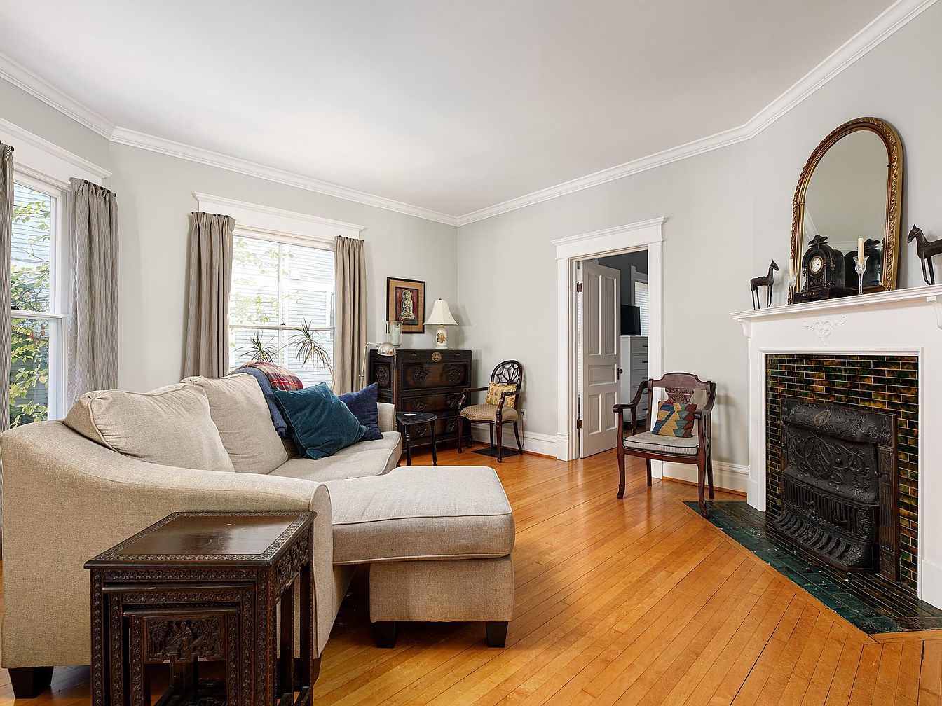 A cozy living room featuring a soft beige sectional sofa adorned with colorful throw pillows, providing both comfort and style. Natural light streams in through large windows draped with gray curtains, enhancing the space’s warm ambiance. Rich wooden flooring contrasts beautifully with the light walls, which are painted in a soft hue, maintaining an inviting atmosphere. A vintage fireplace with intricate tile work and an ornate mirror above adds character, while an elegant chair and a decorative side table emphasize classic design elements. A charming accent table with detailed carvings complements the room’s historic elegance.