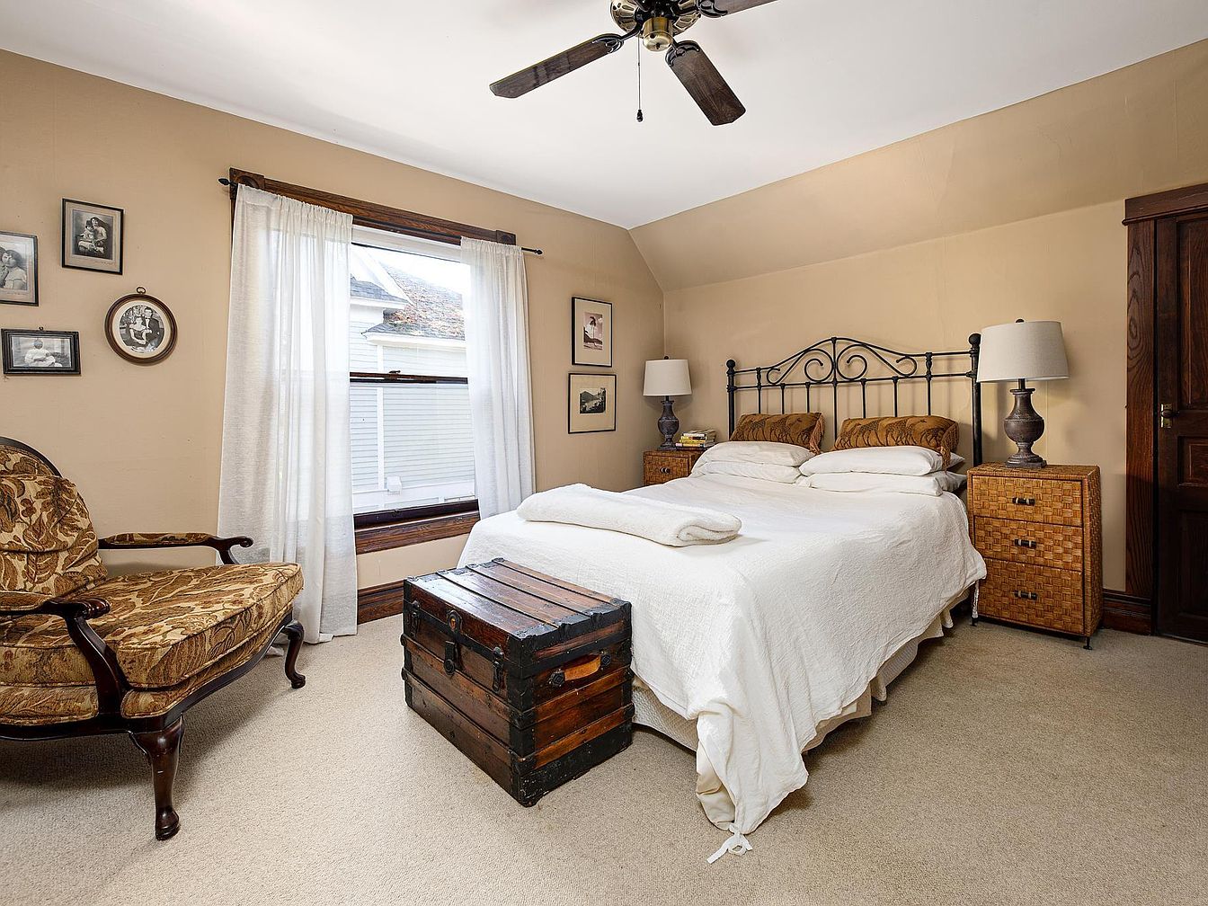 This cozy bedroom features a soft beige color scheme with textured walls. A decorative metal bed frame holds white bedding, complemented by carved wooden nightstands topped with classic lamps. A vintage trunk sits at the foot of the bed, adding functional charm. The room includes a plush, patterned armchair near the window, surrounded by a three-panel window dressed with sheer curtains, allowing natural light to filter through. Framed photographs adorn the walls, enhancing the vintage aesthetic. Dark wood accents, such as the door and window trim, contrast beautifully with the lighter tones, creating a warm and inviting atmosphere.
