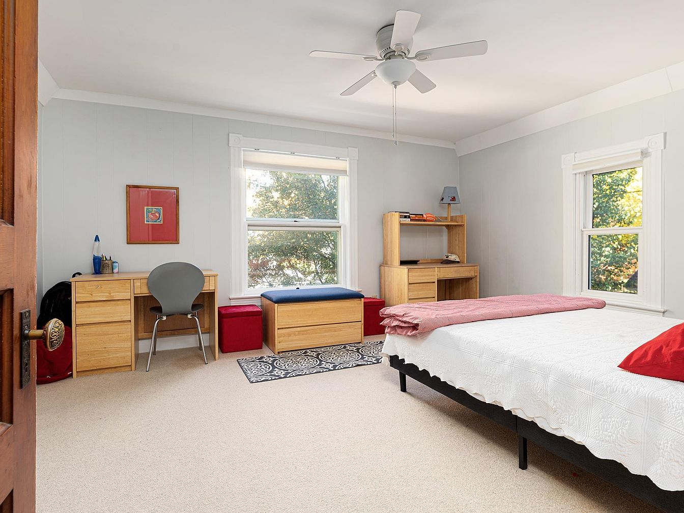 This cozy bedroom features a warm, inviting color palette with light gray walls and soft beige carpet. Natural light floods the room through two large windows adorned with white trim, enhancing the brightness. A queen-sized bed with a textured white coverlet and vibrant red accent pillows creates a focal point, while a stylish throw blanket adds warmth. Multi-functional furniture includes a wooden desk paired with a sleek gray chair, offering a workspace. A storage bench beneath the window and a small red cube add functional touches. The overall design balances minimalism with comfort, promoting a serene atmosphere.