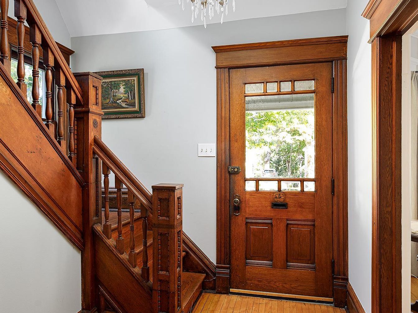 The entryway features rich wooden elements, highlighted by a majestic staircase with finely crafted balusters. The staircase, made from polished hardwood, complements the intricately designed casing of the front door, which boasts glass panes that allow natural light to filter in. Soft gray walls provide a subtle backdrop that enhances the warm tones of the oak wood. A classic chandelier hangs overhead, adding elegance. A framed painting of a serene landscape adorns the wall, contributing an artistic touch that invites warmth. The overall aesthetic combines classic architecture with a welcoming ambiance, perfect for setting a refined tone.
