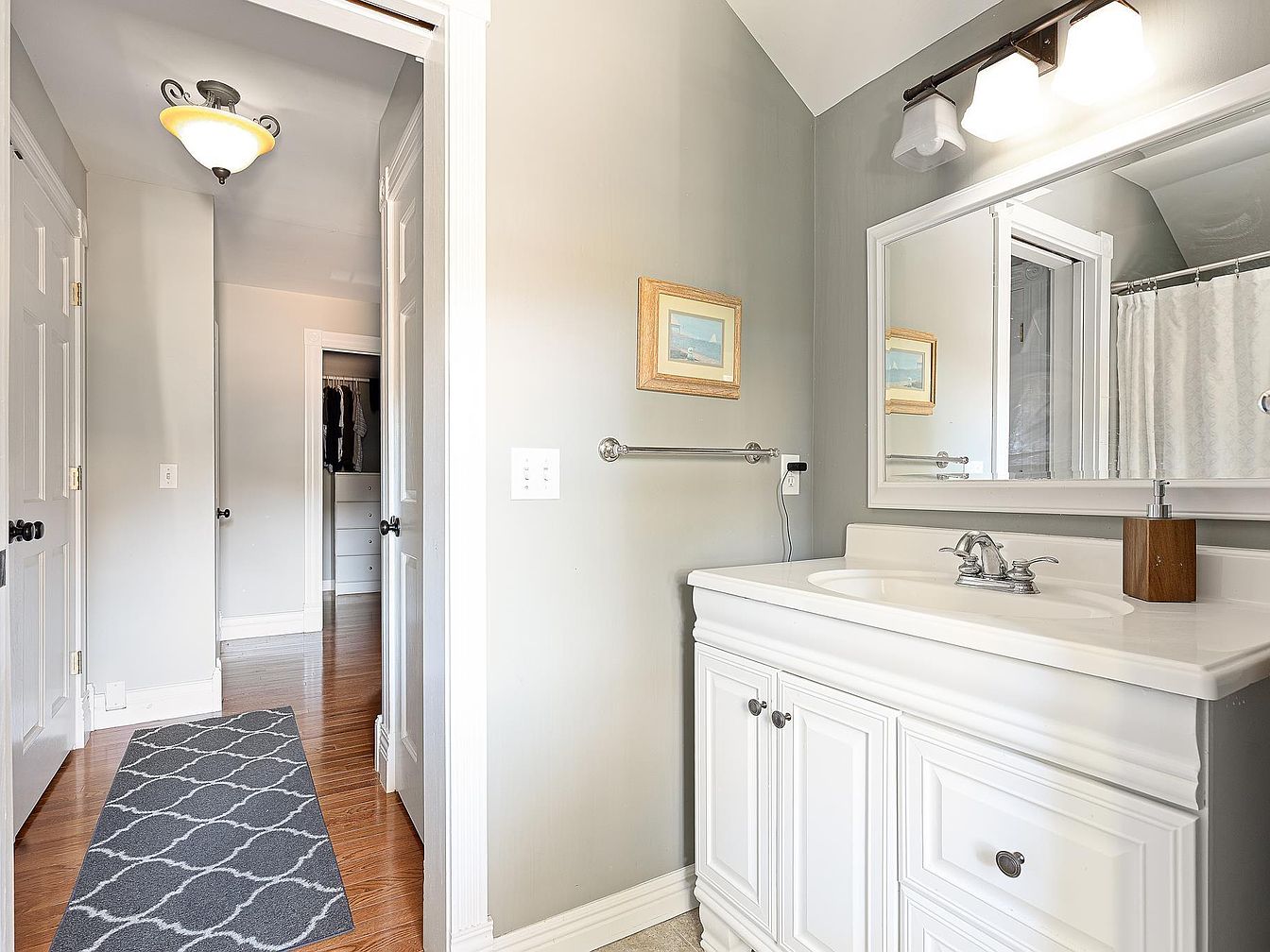 This bathroom features a clean, minimalist design with soft gray walls that create a tranquil ambiance. A white vanity with elegant cabinetry and ample storage is topped with a smooth, white countertop. The sleek faucet complements the modern aesthetic. Above the vanity, a large mirror is framed in white, enhancing the spacious feel. Three light fixtures illuminate the area, casting a warm glow. The space includes a textured gray area rug, adding comfort, while light-colored flooring unifies the look. A framed artwork hangs nearby, contributing a touch of personality. The doorway leads to additional rooms, implying functionality.