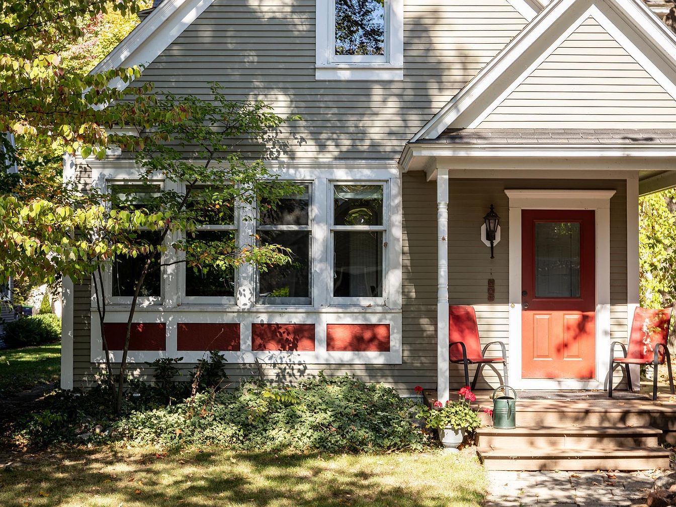 The front entrance showcases a charming architectural style, highlighted by a vibrant red door that welcomes visitors. Flanking the door are two black metal chairs, creating a cozy seating area. The exterior walls are painted in a soft beige with bold red accents, enhancing the visual appeal. Windows are framed with white trim, allowing natural light to fill the interior. A well-maintained stairway leads to the door, adorned with a green watering can and potted flowers that add a touch of nature. Surrounding trees provide shade, further complementing the inviting atmosphere of this historic home.