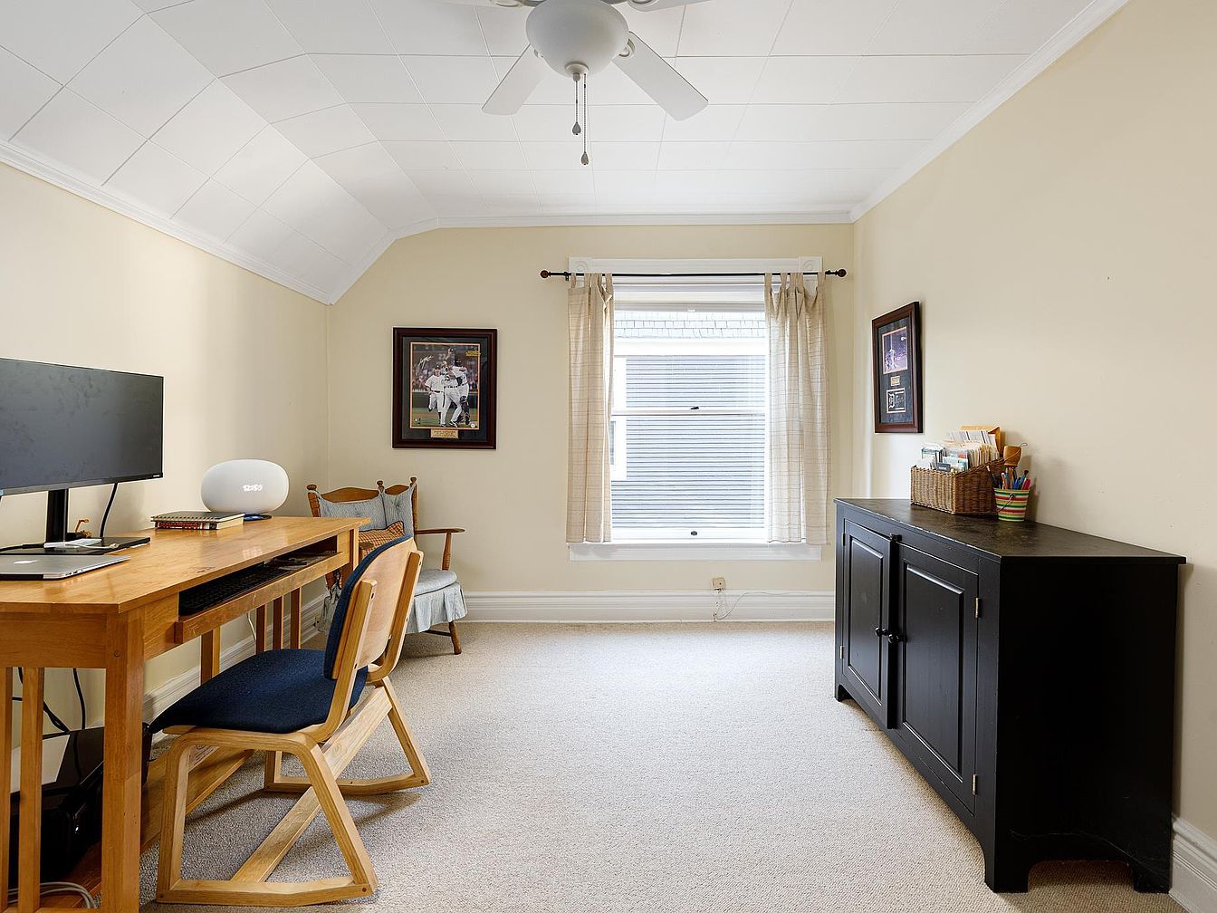 A quaint home office features a light, neutral color palette with beige walls that enhance natural light. The ceiling’s subtle curves add character, while soft beige carpet creates warmth. A wooden desk, modern in design, holds a computer monitor and a small white speaker, embodying functionality. Nearby, a wooden chair with a blue cushion invites comfortable seating. A vintage rocking chair, adorned with gray fabric, offers an inviting touch. Behind, a black cabinet provides storage space and displays decor. Soft, sheer curtains frame the window, allowing sunlight to filter through, creating a serene and productive atmosphere.