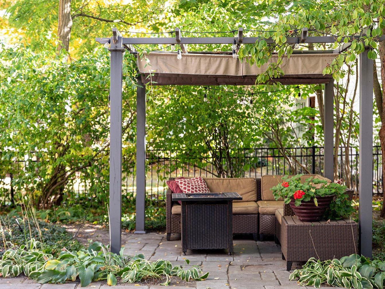 The outdoor patio features a cozy seating arrangement under a classic pergola, offering a serene retreat. Neutral-colored cushions adorn the deep seating, complemented by a patterned accent pillow for a touch of visual interest. A dark wicker coffee table sits centrally, providing a practical space for refreshments. The surrounding greenery, dense with lush foliage and ornamental plants, creates a tranquil atmosphere, while the stone-paved floor adds a rustic charm. The gentle dappled sunlight filtering through the leaves enhances the warmth and inviting feeling of this outdoor oasis, perfect for relaxation or casual gatherings.
