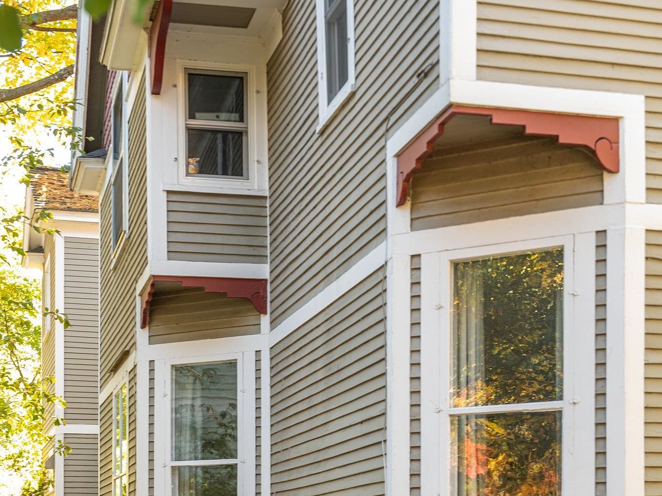 The image highlights the exterior corner of a historic American home, showcasing a blend of architectural elements. A prominent bay window features large panes framed in white, enhancing natural light in the interior. Its intricate trim is painted red, contrasting with the muted beige clapboard siding. Above the window, decorative brackets add a charming detail, while the structure’s layered design creates visual interest. The interplay between the horizontal lines of the siding and the vertical windows emphasizes the home’s height. Surrounding greenery hints at a lush garden, contributing to a warm, welcoming aesthetic.