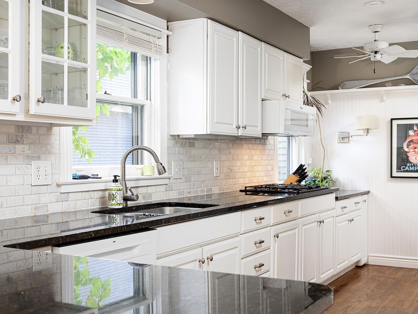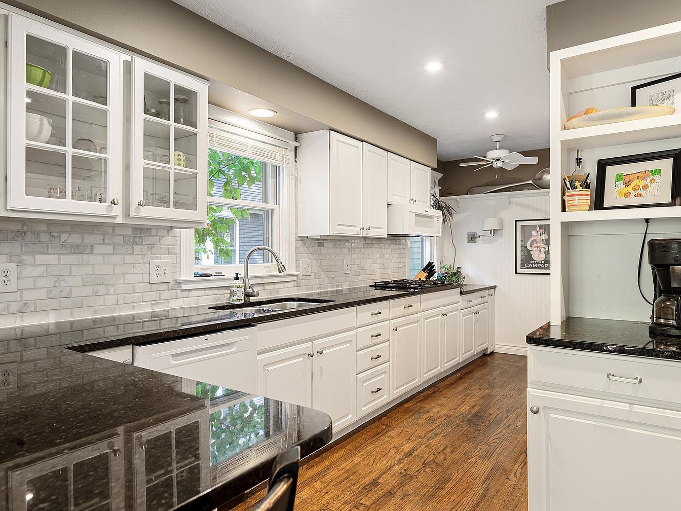 The kitchen features a sleek design with white cabinetry contrasted by dark granite countertops. Glass-front cabinets allow glimpses of dishware, enhancing openness. The backsplash, formed with light-colored tiles, adds texture, while the window invites natural light, complemented by greenery outside. A stainless steel sink with a modern faucet sits within the countertop, alongside a gas stove. The room’s color palette includes soft earth tones on the walls, creating a warm atmosphere. A ceiling fan and wall light fixture provide functional elegance. Overall, the space exudes a contemporary yet inviting vibe, perfect for culinary activities.